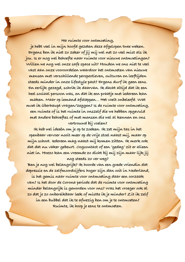 Graag laat ik je kennis maken met mijn onderzoek. Mijn onderzoek vertrekt vanuit een persoonlijke fascinatie voor menselijke nabijheid in de publieke ruimte, en de afwezigheid daarvan. Ik merkte dat spontane ontmoetingen met onbekenden steeds schaarser worden, terwijl juist die onverwachte gesprekken en kleine gebaren mij energie geven. Deze observatie vormde het beginpunt van mijn zoektocht naar de ruimte voor ontmoeting: bestaat die nog, en zo ja, waar vinden we haar terug?