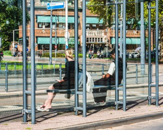 Mensen die op een bankje zitten vaak zo veel mogelijk afstand van elkaar nemen, waardoor de ruimte tussen hen letterlijk zichtbaar wordt.