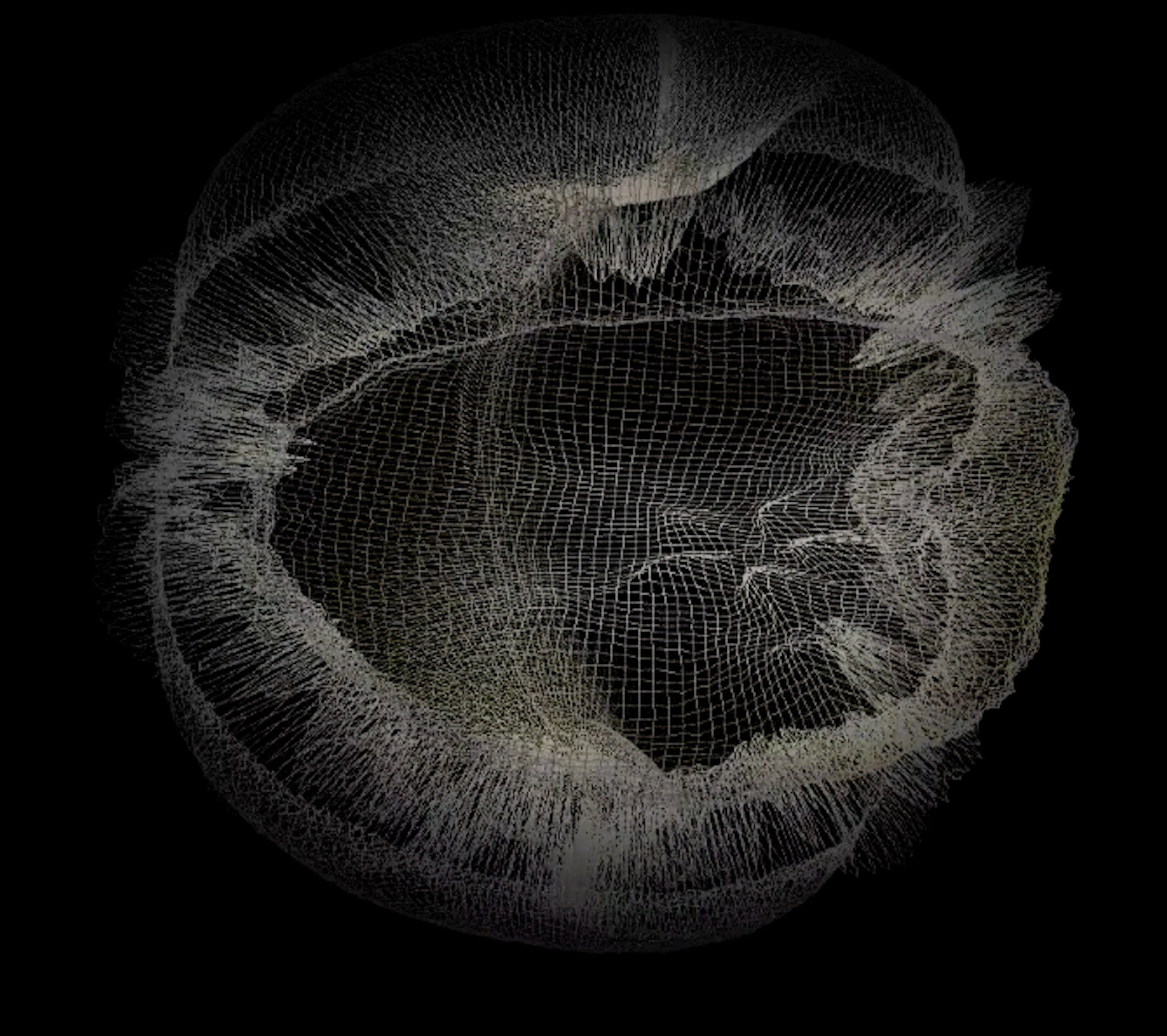 - I use charcoal because it is a very flexible medium that allows me to produce a wide variety of strokes and tones. I detect very brief events which I translate into dots; variations in sound intensity: blacks correspond to loud sounds, different greys to softer sounds, whites to silence – the latter being relative, it corresponds to what escapes my perception, for example masking effects caused by obstacles. I also detect movements, air masses and climatic changes around me. These are reflected in the momentum and orientation of points, lines and surfaces. [I also use these cues to script my animations: they are the source of the inner momentum and directionality of the simulated whole; they even allow me to (fore)see the dilution, or even dissipation, of the effects]. The blending of the effects of the built form, materials and (micro-) climate generates an autonomous corporeality whose structure, depth, relief, transparency, and momentary dynamics I seek to represent. The simulation makes this sort of slice of sound cloud explorable. The virtual eye-camera, for example, allows you to dive into the craters of this sound cloud.