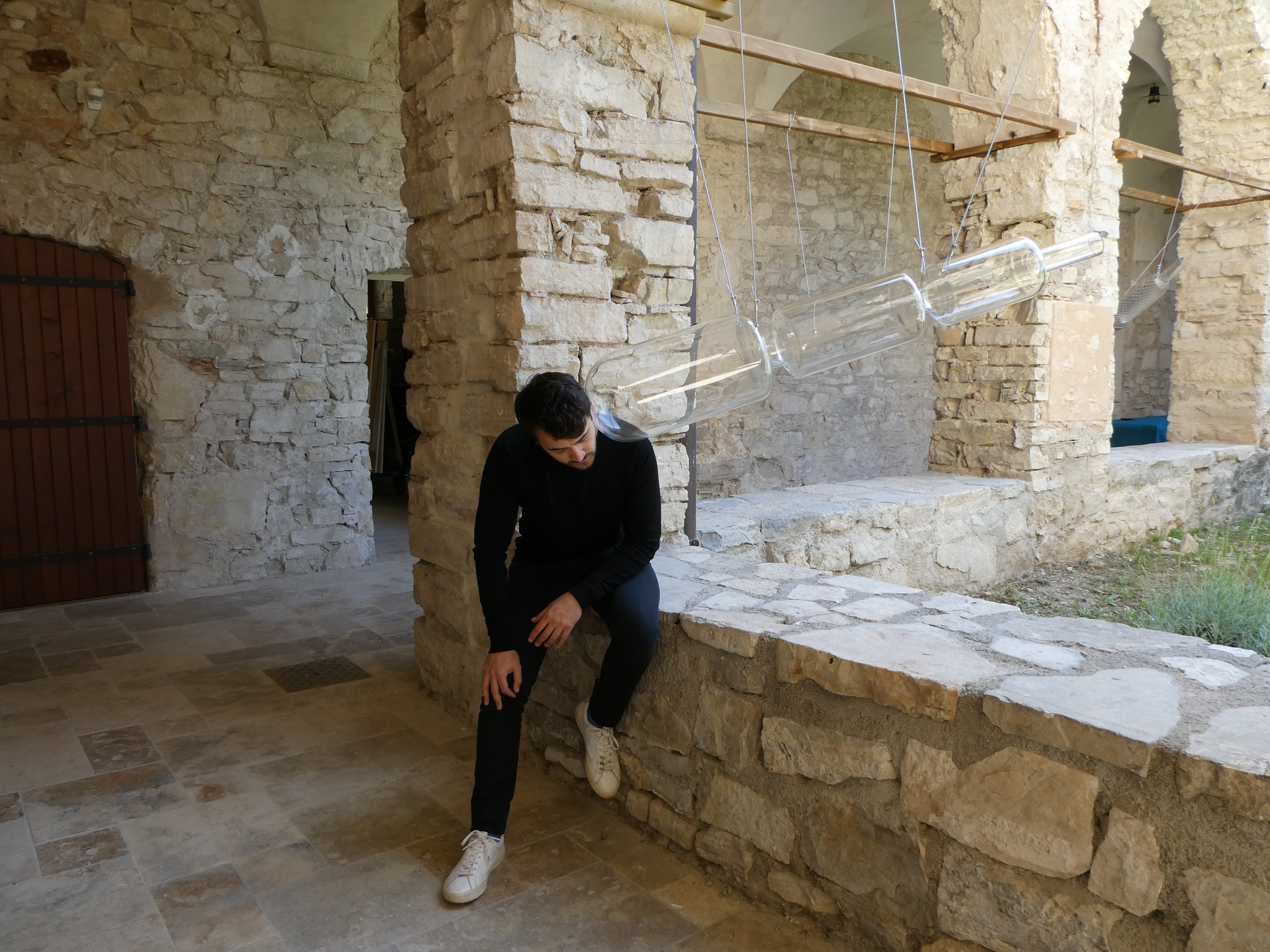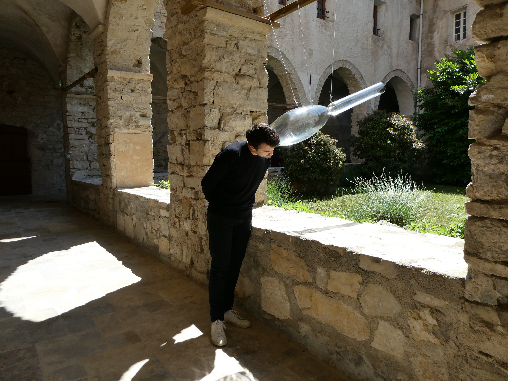 Capable of withstanding very high pressures and temperatures (up to 1200°C, while remaining cold on the outside), glass has enabled me to work with the ambient climate. The resonators retain nocturnal humidity, which they store for quite a long time. Exposed to the sun, they heat up. As the air is also constrained by bottlenecks, this generates a certain internal dynamic: currents and mini turbulences are formed. The humidity/heat duo gives the resonators a certain internal atmosphere that can be heard (sounds that are humid, heavy, floating, swirling, harmonious, clean) and felt in the form of light pressure and other tactile effects.