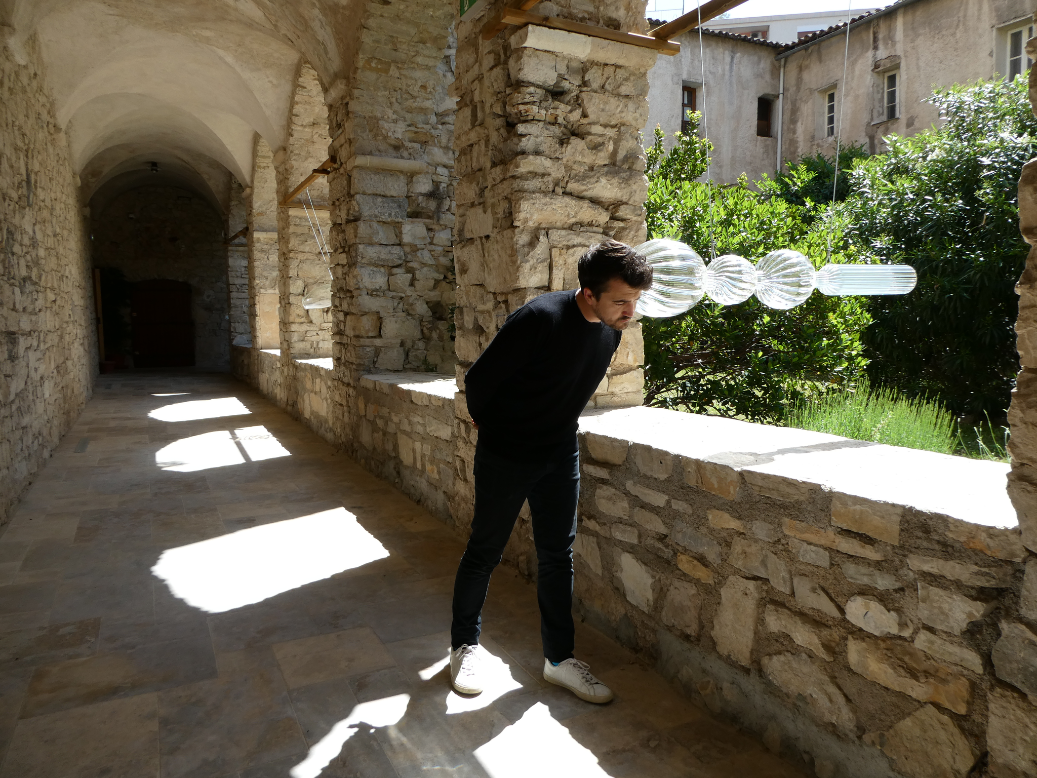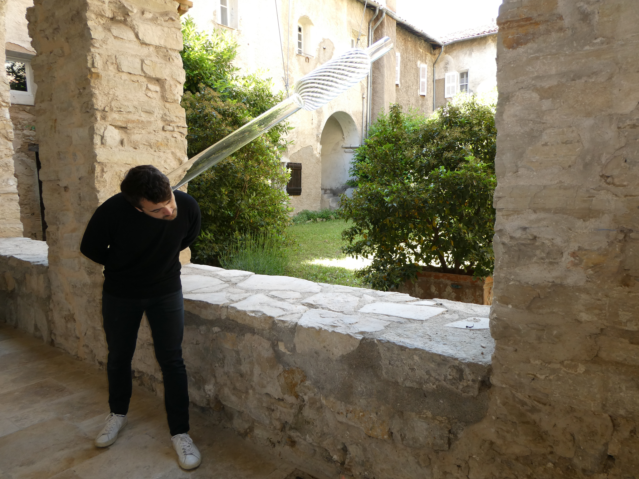 I began this project by exploring the cloister garden of the Chapelle de l’Observance. Searching for characteristic sound phenomena, I identified a range of frequencies and wave-like dynamics, which I then transcribed into glass sculptures. Their volumes are hollow, of varying lengths, narrow, smooth and fluted. They have openings on both sides, allowing air and sound to circulate freely in situ in vivo. They act as auditory and ocular devices.