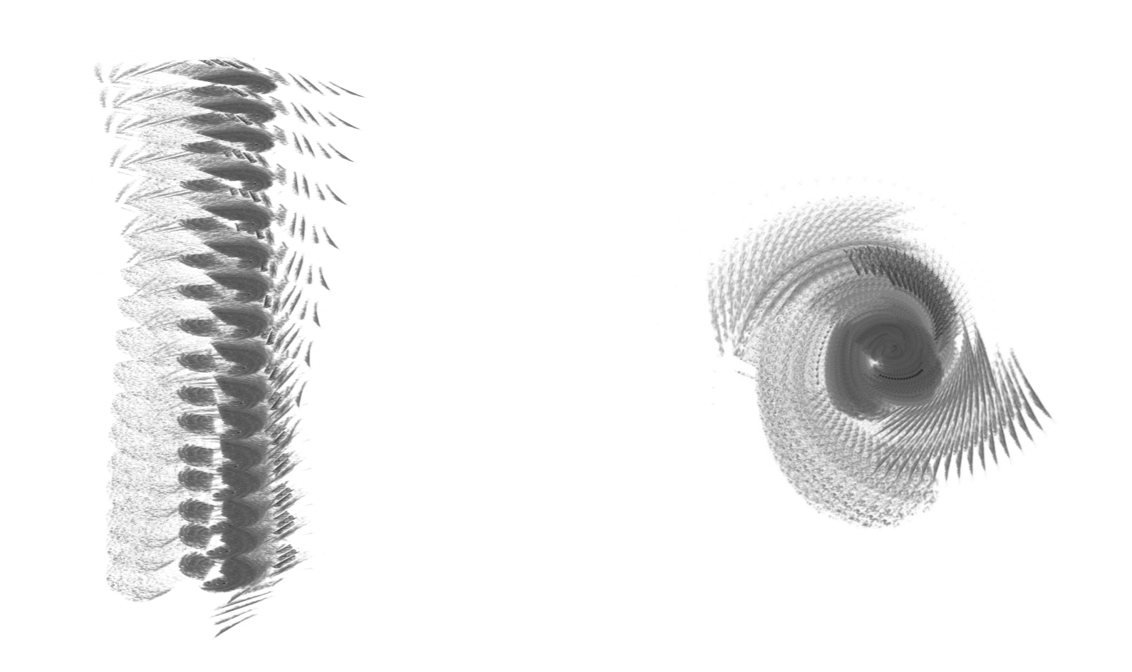 Figure 7: Extract of an animation which shows studies of two village fountains. I represent a systematic backbone view and a top view of a listened sound motif. The difference between the two views is that the first multiple is drawn from the front of the source (sound of running water as designed within the fountain), while the second multiple is drawn about five minutes later from the back of the same sound source. Please read these multiples from left to right and top to bottom. We can identify and compare what happens when turning 180°, for example double spins inside the motif emerge.