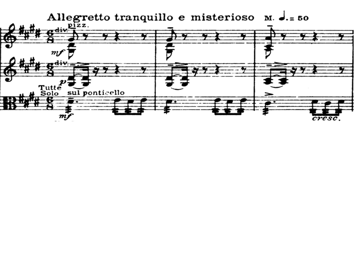 The piece starts at the sunset in Granada, it indicates “misterioso”. The sonority is very similar with the use of brief crescendos and diminuendos as well as a low register of all the instruments.