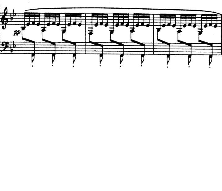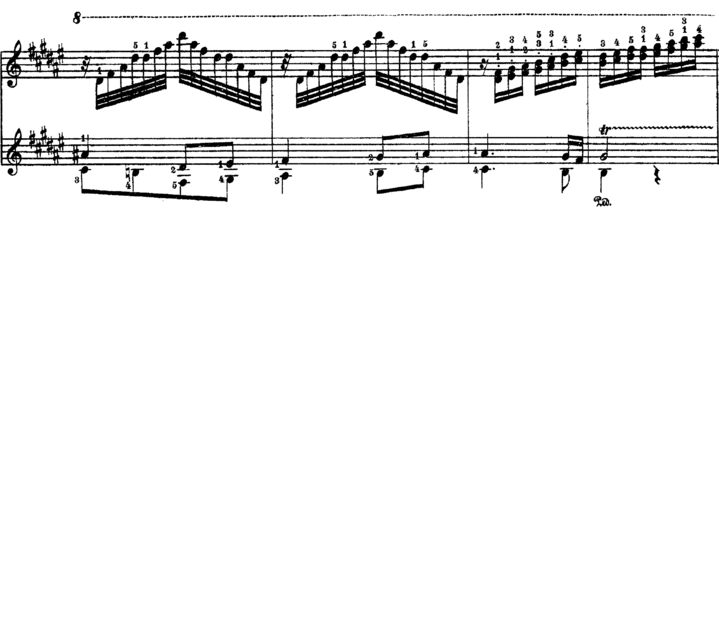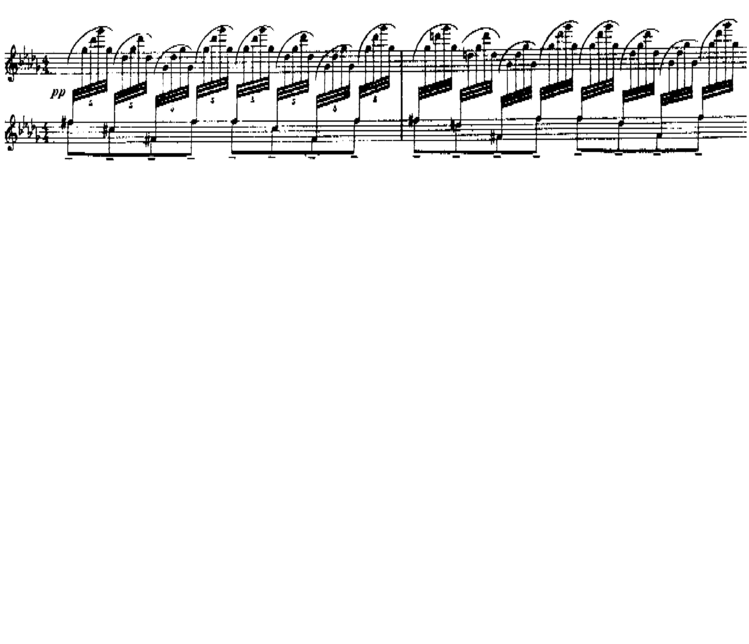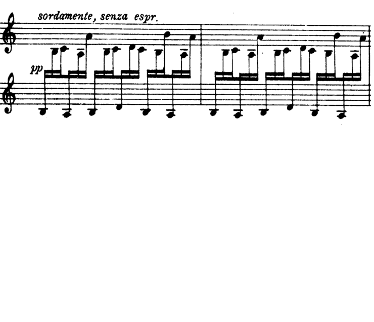 This makes the performer play the semiquavers very superficially and quasi staccato, imitating a harp and trying to recreate this water impression. In contrast with the other examples, the melody is on top, however (as it was already stated in the Cante Jondo chapter) it may be played with a very different touch, remarking his microtonal essence.