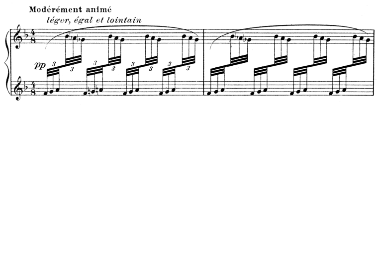 The representation of water is one of the most important topics of the impressionism. Previously, Franz Liszt composed Les Jeux d´eaux á la Villa d´Este (1867-82). In the piece, the composer uses a constant motion of sixteenth notes in order to express a fluid movement; this clearly imitates a water stream. Another characteristic of the piece is that the melody is written a central register of the piano.