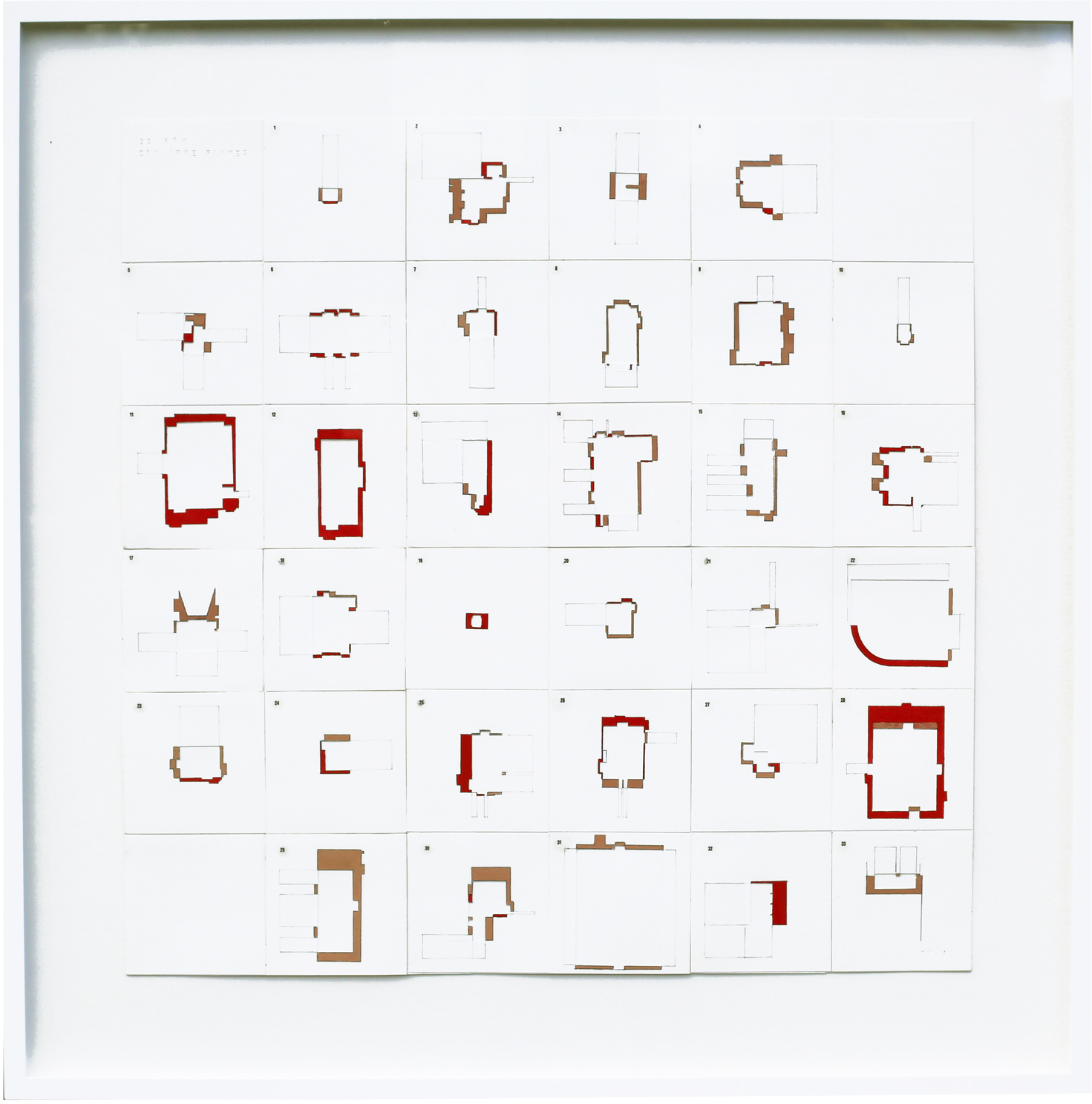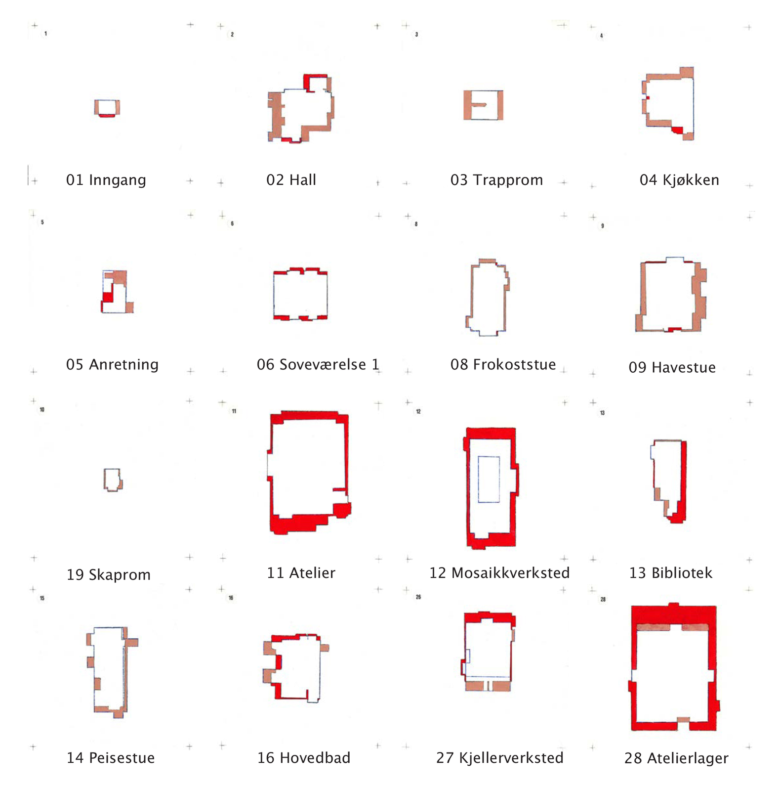 I ”33 rom som ikke finnes” har jeg ønsket å synliggjøre forholdet mellom min opplevelse, mitt minne om rommet og den oppmålte planen. Gjennom en serie håndtegninger utforsker jeg dette forholdet. Etter at jeg hadde tegnet opp alle rommene etter hukommelsen i bildet ”1 sted 33 rom”, målte og tegnet jeg dem nøyaktig opp. Tegningene viser det oppmålte rommet og minnet av rommet lagt over hverandre. Ved å jobbe med forholdet mellom min opplevelse, minnet og den faktiske størrelsen, ønsket jeg og synliggjøre arealet som oppstår i møtet mellom de to: Rommet som ikke finnes. De malte rosa flatene viser minnet av rommet. Den røde fargen viser den faktiske størrelsen.