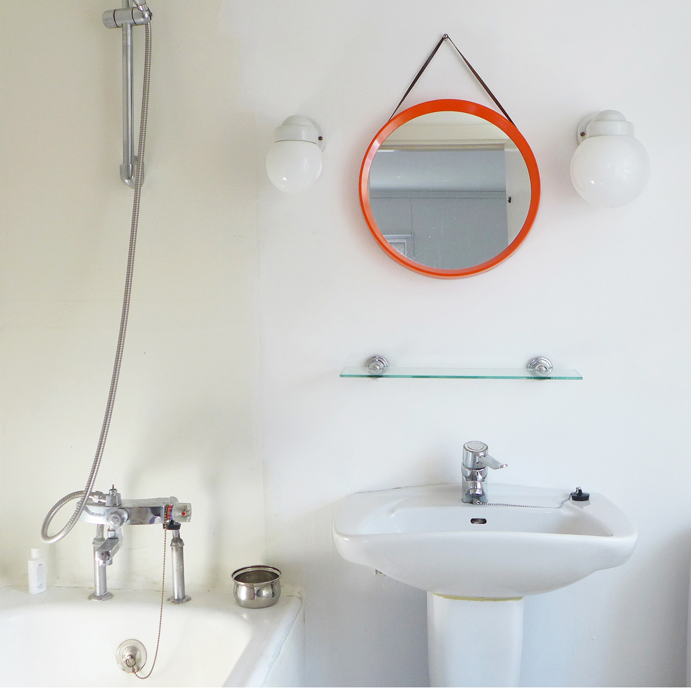 Christine: Badet ligger inntil soverommet i 1. etasje. Jeg har alltid tenkt at dette rommet minner meg om å bo på hotell., et sted hvor soverommet har sitt eget bad. Vi bruker dette rommet som gjesterom og tror at de som overnatter her liker følelsen av å ha sin egen plass i huset. Både Vega og Dyre liker best å bade når de har besøk. Det hender at de bader samtidig med hver sin gjest, i hver sin etasje.