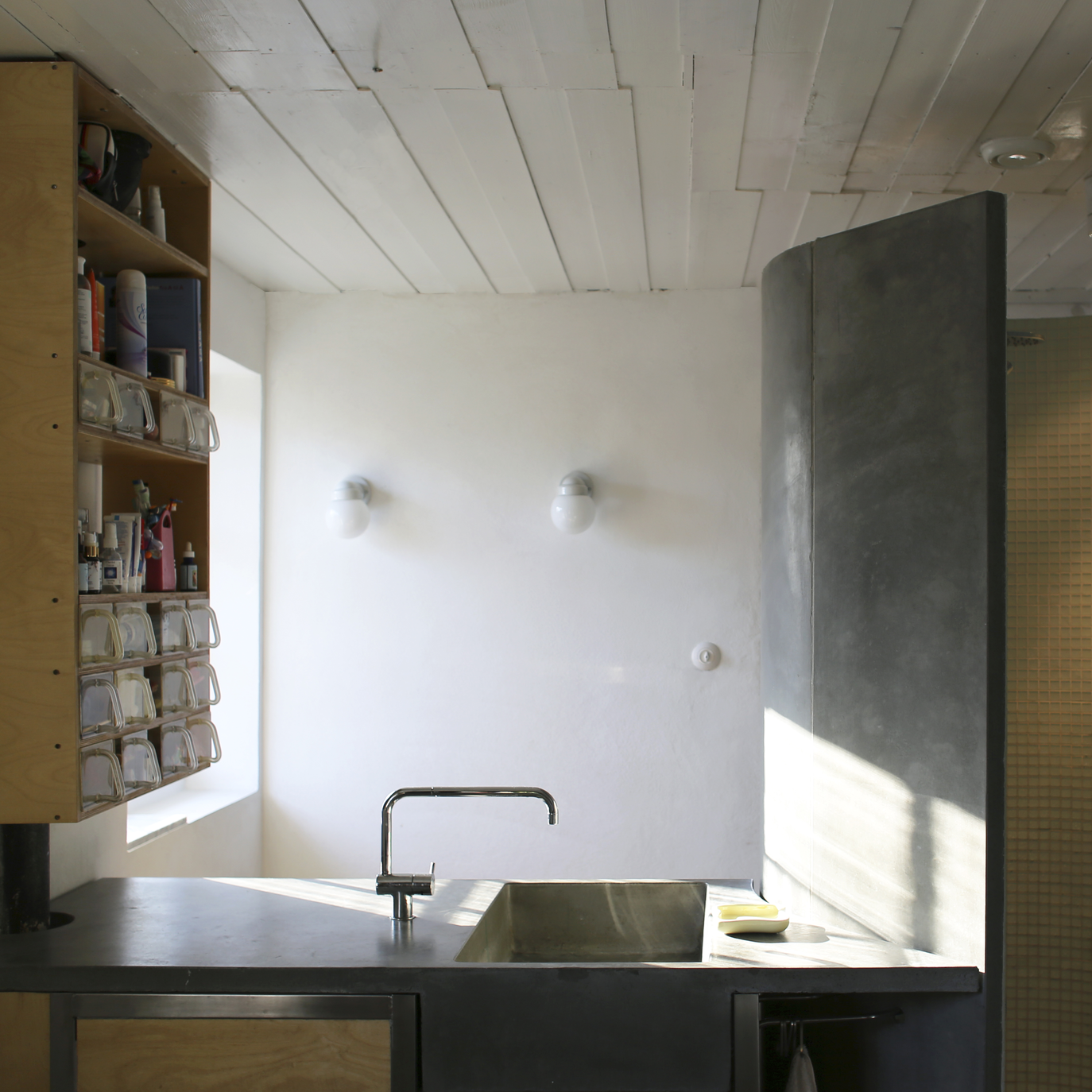Christine: Hovedbadet i 2. etasje er stort og lyst og har tre innganger. Når man ligger i badekaret, ser man opp i ett gammelt asketre. Før vi rev veggene, var denne delen av huset fylt opp av små rom. Her bodde hushjelpen med barna. Det fantes en mørk korridor, et rom for hushjelpen og et lite bad for barna. I korridoren var det montert en bjelle, som ringte hver gang noen i huset trengte hennes tjenester. Fra korridoren kunne hun sende barnas skitne klær fra 2. etasje via en skittentøyssjakt, forbi 1.etasje, ned til vaskerommet i kjelleren.