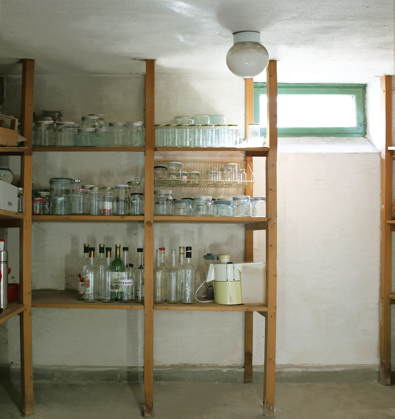 Christine: Matboden er et av rommene i kjelleren som vi bruker aktivt. Den fungerer som en forlengelse av kjøkkenet. Anne kommer fra en familie som er vant til å sylte, safte og høste. En av tingene vi hadde med oss til huset var en stor samling av Norgesglass, sanket gjennom mange år. Noen på loppemarked, andre fra Odalen. Mange fra Elmer og Annefi, tidligere eiere av siste leilighet. Med matboden fulgte et stort antall Norgesglass som Gaute ikke var interessert i å ta med. Han var ferdig med sylting.