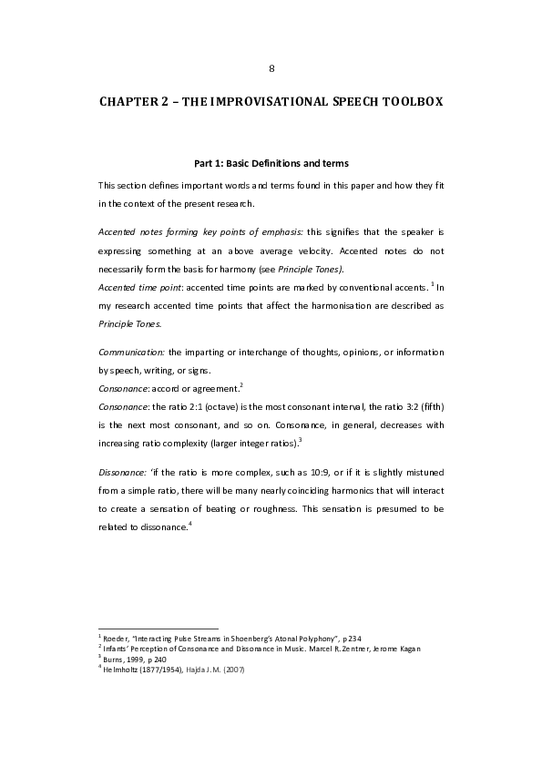 This artistic research investigates the transcription process in improvisational musical landscapes. Particularly the transcription process of speeches and speech patterns for the main purpose of developing and furthering jazz language to communicate more effectively as a communicator-improviser. This research asks the question, how can musicians build improvisational musical language through the study of speech? Effective methods of transcribing practice with the goal of developing the musical ear are developed during this research. These are demonstrated with analysis, harmonisation, survey, additional experiments and a set of improvisations and compositions. A systematic approach to improvisation in a spoken style will be shaped and consequently, the ‘voice on the piano’ will be found. These outcomes will be presented with the aspiration to venture toward melodic and harmonic possibilities of functional harmony not yet established in improvisational vocabulary.