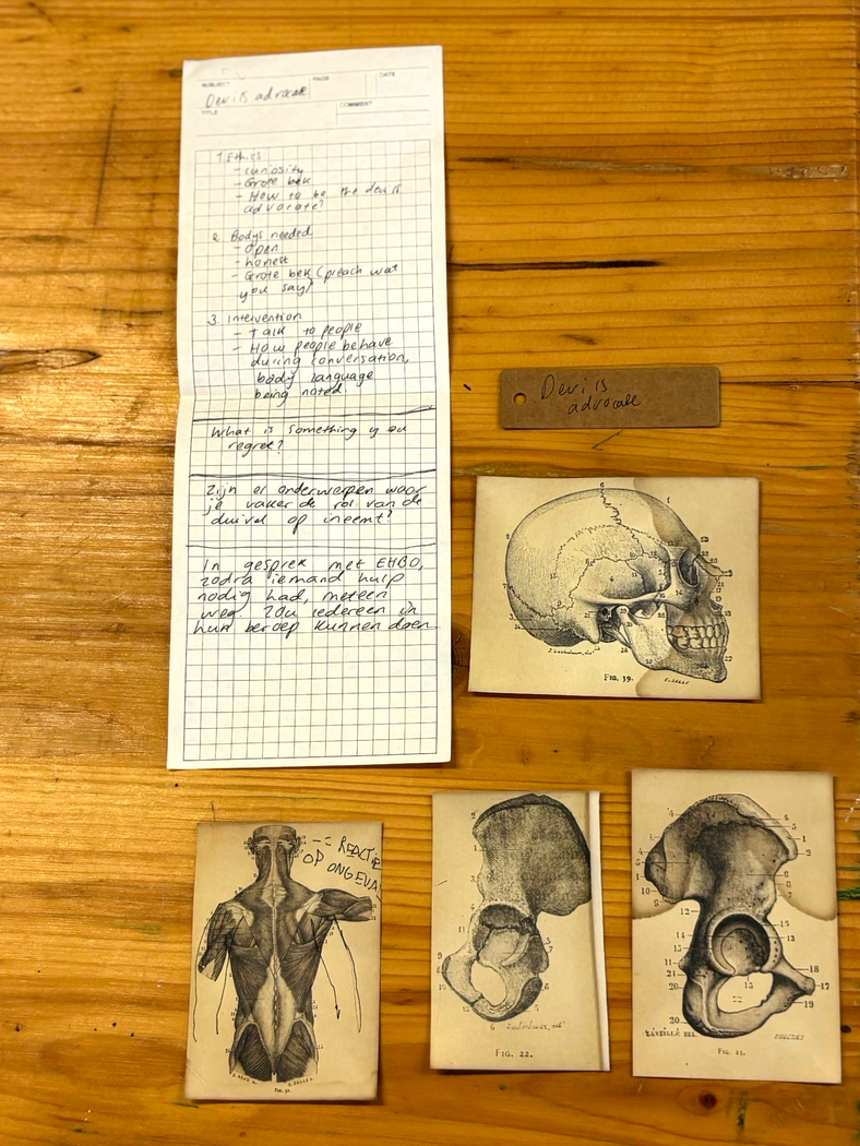 Group 1 started with an intervention that produces bodies with a “grote bek”: a quality that according to them is language specific and could be cultivated more, at least in certain contexts. They set out to interview people about experiences of having a “grote bek” or to be “the devil’s advocate” and to observe their bodies while talking about this. Priming themselves with this focus, they ended up in a situation in which they interviewed two first aid workers, who were called to action because somebody cut their finger. The group witnessed their body changing as they shifted to professional action mode. As they went out into the field with anatomical paper charts, they were cued to particularly focus on the neuro-muscular bodies of these workers, as they “dropped” their arms and shoulders, as though dropping everything to be ready for action.