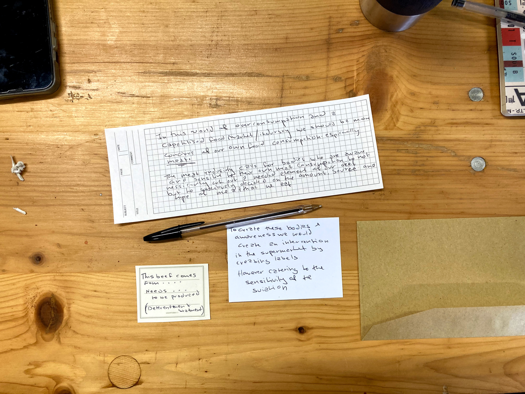 Group 4 created alternative labels for food packaging. Aiming to create awareness about meat consumption, they articulated detailed contextualisation: what is at stake when eating meat? What and who is involved in the production of this food and what do we incorporate while eating it? What would change if we are more aware of everything that is attached to what we consume and how can packaging play a role in this?