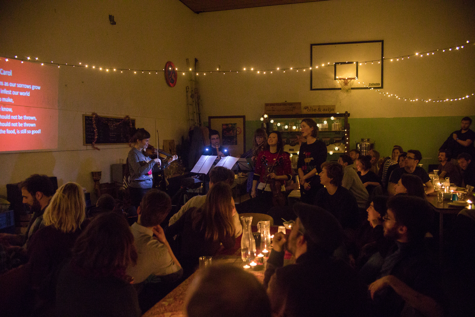 As we can see, much of what was happening in the 18th century created a vastly different concert experience than what 21st –century musicians and audiences might be used to. What might it look like to incorporate some changes to our own concert experiences? As our cultural lens has changed with time, so what created the environments of the 18th-century public concerts would not necessarily create the same experience today. As a performer, I have given a great deal of thought to this and have begun experimenting in a new series I run with a friend, Emma Williams, entitled MusicBox. In our inaugural concert, we paired with an organization in The Hague called Conscious Kitchen, which aims to reduce food waste by collecting unwanted food from the Haagse Markt and cooking a weekly or biweekly meal in a community space. Individuals either volunteer for one of the jobs or pay €5 for the meal. The community eats together and can take home extra produce that wasn’t used in the making of the meal. Our MusicBox concert was given in conjunction with the meal that happens biweekly on a Sunday evening and therefore provided us with an audience of about 80, made up mostly of young, non-musicians.