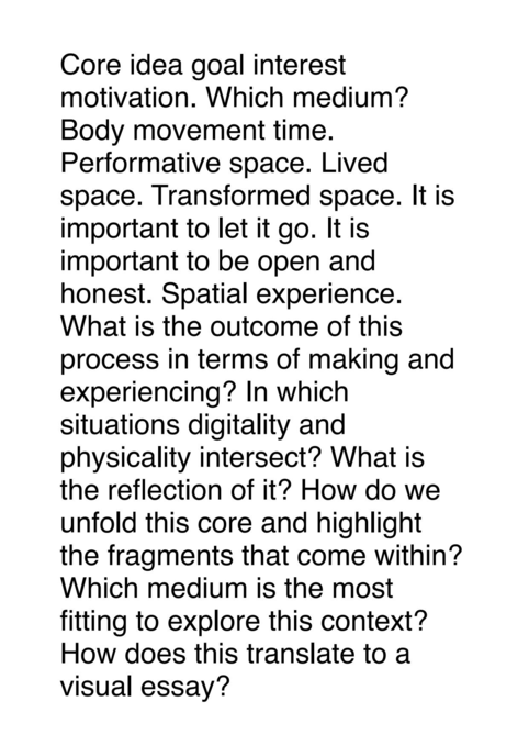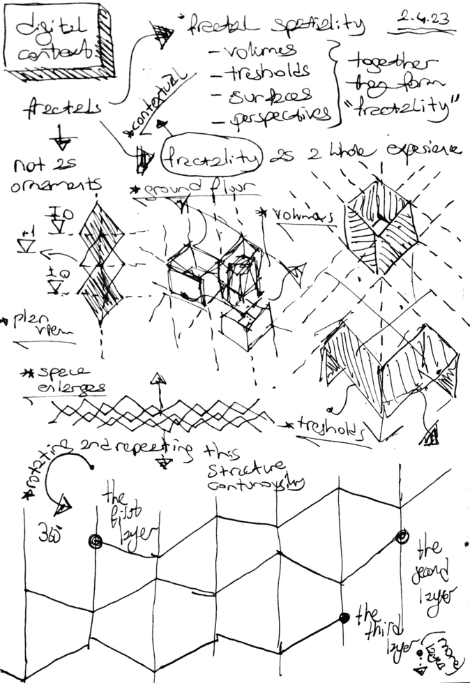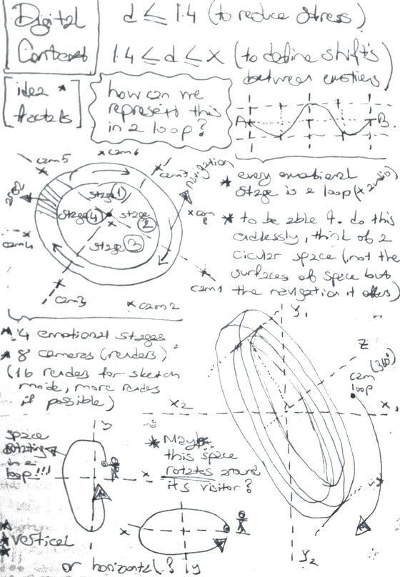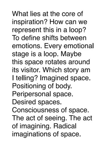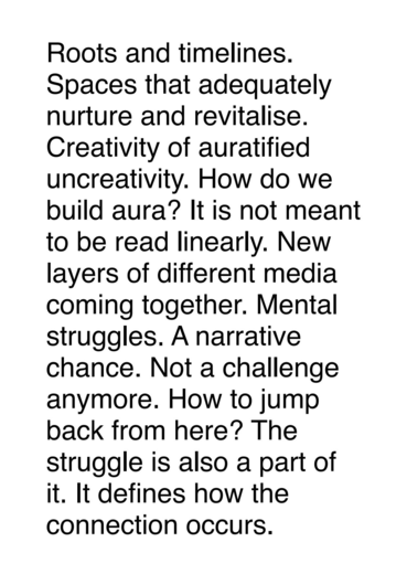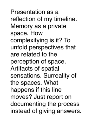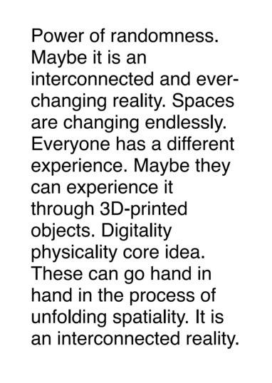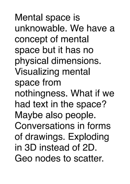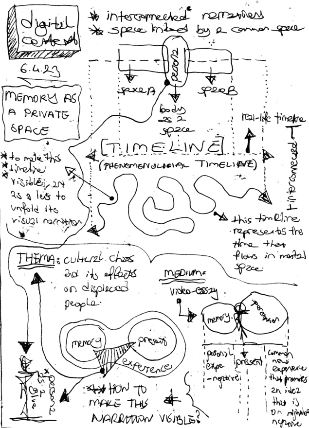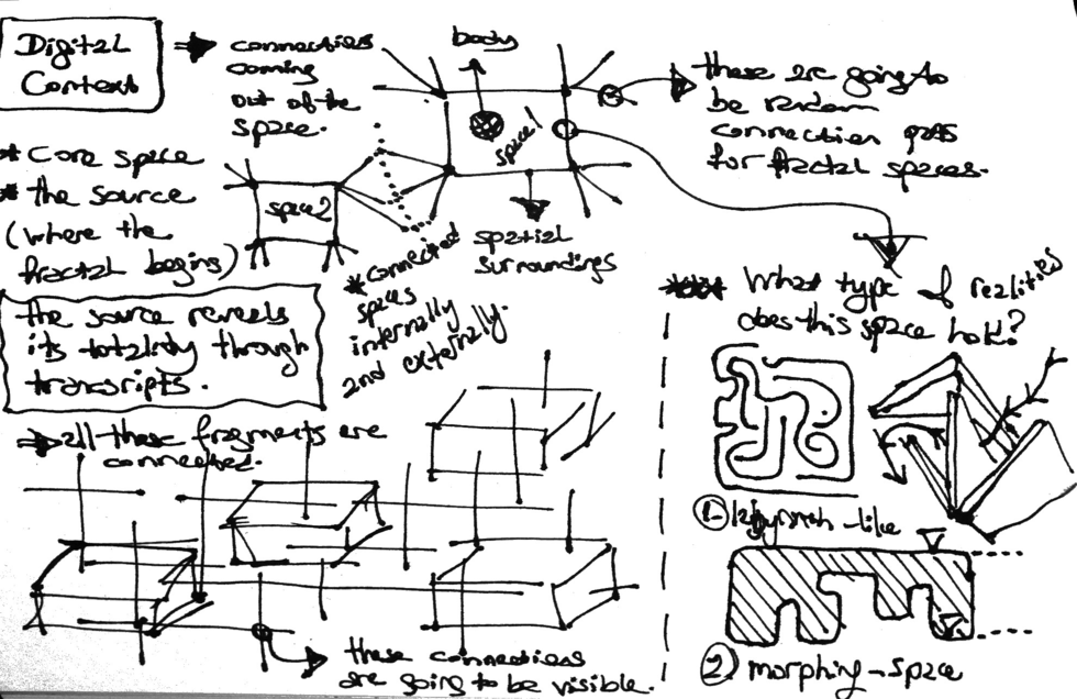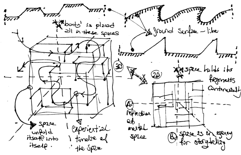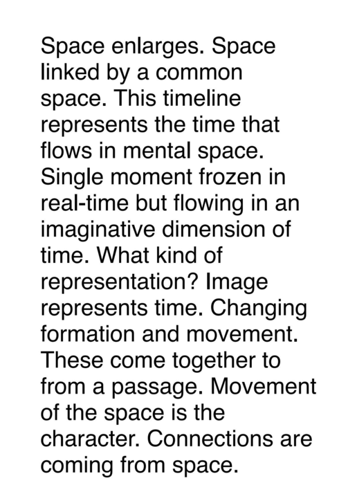 Architecturally embracing mental space and showcasing it as a shared liminal dimension is a process of encouraging us for reanimating this space again and again. By converting mental space into a character that breathes, pulses, and moves, I have hereby communicated through fluid spaces as if they are flaneurs of our minds. In order to construct these methodologies, I have collected all these previously suggested references and contextualized them by integrating their aspects into a virtual space-making process. As I refer to time as non-linear but relational, as it jumps in-between happenings and brings its qualities out as spatial components, during this research I accumulated a variety of different agencies in forms of textual and visual reflections. All of these components came together to accumulate power as journals, essays, diagrams, sketches, videos, and virtual environments by visualizing a non-visual component within the fabric of our consciousness.