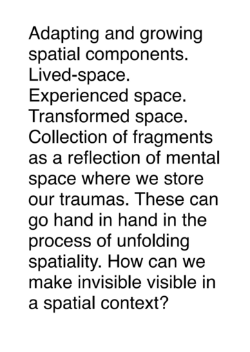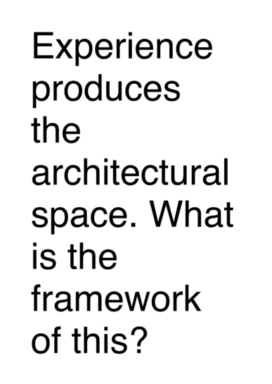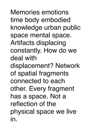 Lefebvre’s interdisciplinary approach constructs a very effective perspective to understand the totality of spatial context: “Nothing disappears completely ... In space, what came earlier continues to underpin what follows ... Pre-existing space underpins not only durable spatial arrangements but also representational spaces and their attendant imagery and mythic narratives.” (Lefebvre, 1991) By reconstructing these essentials into a visual exploration, our sense of space can have the possibility of extending itself within the context of mental space.