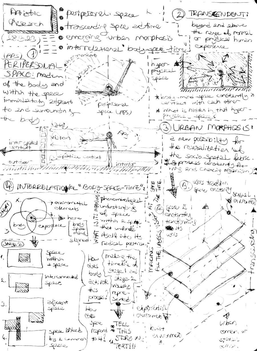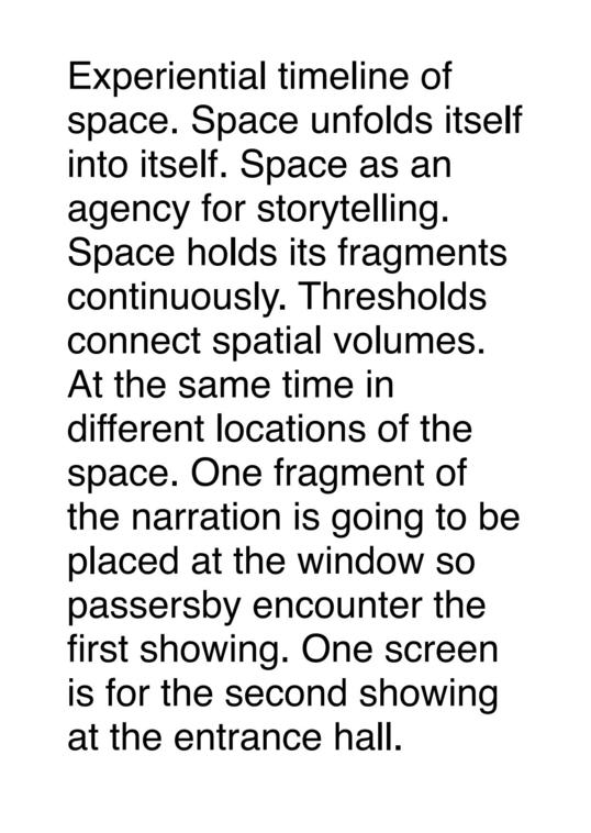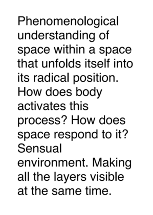 Phenomenology is, in fact, a purely descriptive discipline, exploring the field of transcendentally pure consciousness by pure intuition (Husserl, 1982). Rethinking spatiality through phenomenology can help us manipulate time by speculating new confrontations toward removing it from a linear structure and implementing it into a relational reconstruction. This approach focuses on understanding the subjective experiences of entities as they engage with spatiality, rather than relying solely on measurable factors such as size or technical specifications.