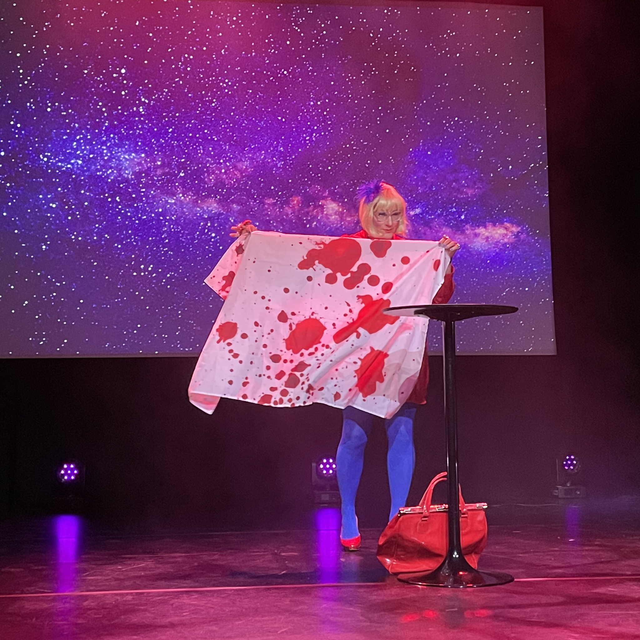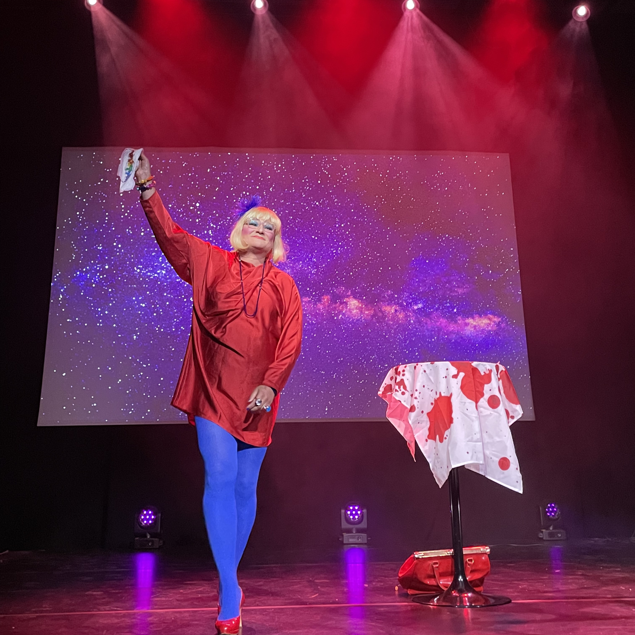 The set-up of Maimu Brushwood’s speech stems from the second artistic component of my doctoral research, a drag performance (in the image) , through which questions of embodiment, performativity, and artistic authorship are explored. Within this frame, the speech reflects on how drag can function as a critical, humorous, and affective methodology in artistic research.