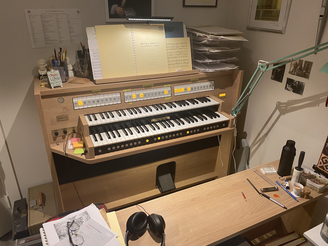 Her er vi igjen inne på det som jeg snakket om tidligere, å gå på tvers av forskjellige sjangere. Det er i mitt tilfelle ikke noe jeg egentlig har bestemt meg for. Folk spør meg som regel om jeg har valgt meg ut en modus fra Messiaen som jeg komponerer ut i fra, eller har latt meg inspirere av, men det kjedelige svaret er at jeg improviserer som regel noe jeg liker fram i lyset. Rent kompositorisk trives jeg aller mest i nattverden i gudstjenestesammenheng, hvor dette med meditasjoner er noe jeg finner meg så veldig hjemme i. Gi meg et svellverk meg voix celeste, gambe og en tremulant og jeg har det som plommen i egget. Jeg må få tid med instrumentet mitt, og det å ha et digitalt orgel i sin egen stue har vært til enorm stor hjelp. Her er mitt Johannus Studio 150.