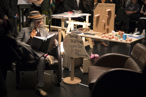 Now here I hold a tongue in my hands. It’s hard FOR LIFE, a virtually indestructible jesmonite sculpture. This thing will outlive us all…think of that…you will die this will continue living. LALALALALALA….