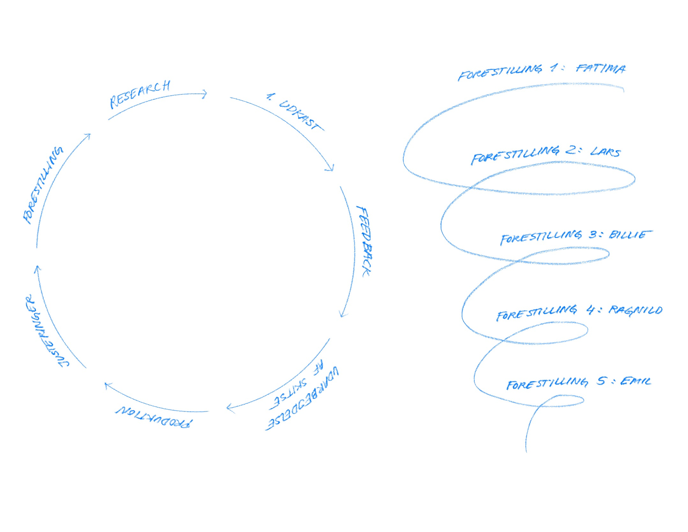 På baggrund af disse etiske overvejelser blev det hurtigt klart, at en grundig researchproces var nødvendig. I udviklingsfasen til hver forestilling har jeg derfor udført tre fokusgruppeinterviews med personer fra hver af de udvalgte befolkningsgrupper. Gennem denne metode har deltagerne haft mulighed for at respondere samtidigt for derved at fokusere på en fælles konstruktion af mening (Aarhus Universitet, u.å.). Jeg havde hertil forberedt fem spørgsmål til at styre samtalen ud fra, men var ligeledes opmærksom på at facilitere en fri interaktion mellem deltagerne. Her ses et udkast fra 2. interview i researchfasen til forestillingen om Emil: