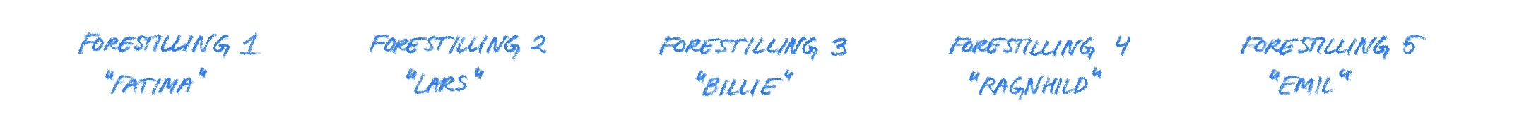 I konceptualiseringen af projektet har jeg forsøgt at skabe et mangfoldigt univers ved at inddrage forskellige perspektiver. Hver forestilling repræsenterer derfor en person fra hver sin befolkningsgruppe – hhv. en mellemøstelig kvinde, en hvid mand, en nonbinær person, en gammel kvinde og en funktionsnedsat mand. Karaktererne spilles dog alle af skuespillere, hvis private identitet er i uoverensstemmelse med karakterens for på denne måde at undersøge, hvorvidt teatret som medie fortsat evner at skabe en overbevisende og kærlig fiktion.