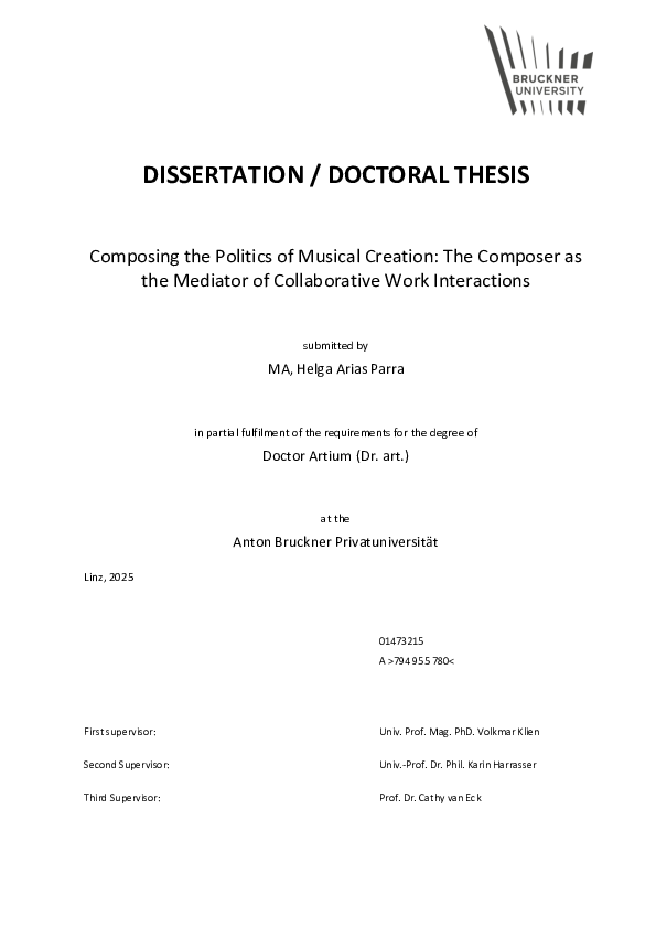 This Research Catalogue exposition accompanies the written dissertation Composing the Politics of Musical Creation: The Composer as the Mediator of Collaborative Work Interactions, submitted in fulfilment of the requirements for the Doctor Artium degree at the Anton Bruckner Privatuniversität, Linz.