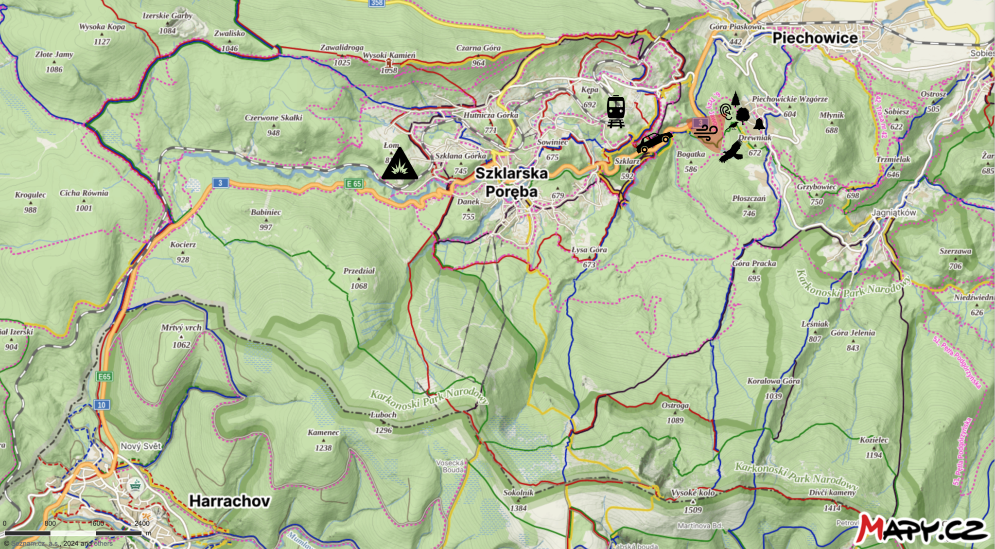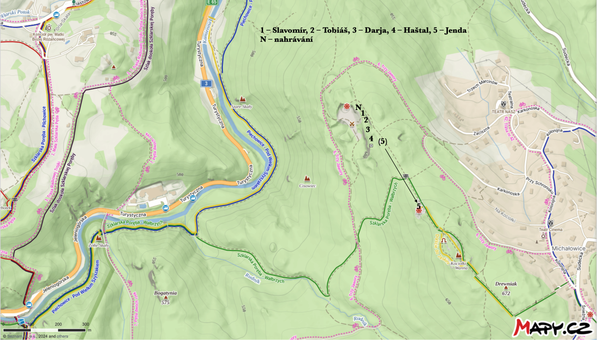 Místo zvolené k naslouchání se nacházelo na zhruba dvacet metrů vysokém skalnatém hřebeni, který přímo pod námi přecházel ve starý opuštěný pískovcový lom. Vyvýšená pozice nám otevírala pohled na západní část krkonošského panoramatu, a především nám umožňovala slyšet zvuky z celého rozlehlého údolí pod námi. Okolo nás byly mladé náletové břízky, v tuto roční dobu zcela bez listí. Tu a tam mladé buky, které si zbytky suchého listí naopak podržely. Za námi se nalézal smíšený les s borovicemi a modříny, o něco dále jihovýchodním směrem vzrostlé duby a buky. Více na východ ležely Michałowice s kostelíkem. V údolí pod námi se ve vzdálenosti zhruba půl kilometru vinula silnice mezi Sklářskou Porubou a Piechowicemi. Za ní se klikatila železniční trať obkružující směrem k nám protilehlé kopce Kepa a Hutnicza Gorka. O něco dále na vzdálenějším okraji Sklářské Poruby, asi 7 km vzdušnou čarou, byl lom, v němž se těží žula. Na obr. 1 níže vidíme schematické zakreslení stanoviště a nejdůležitějších zvukových zdrojů do mapy.