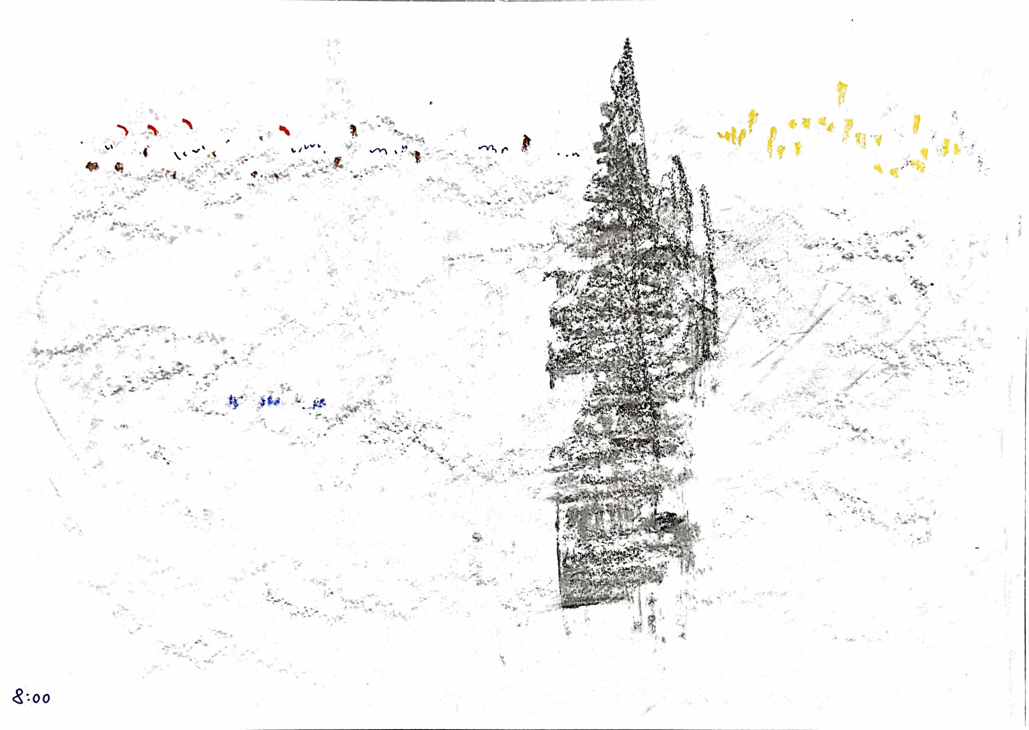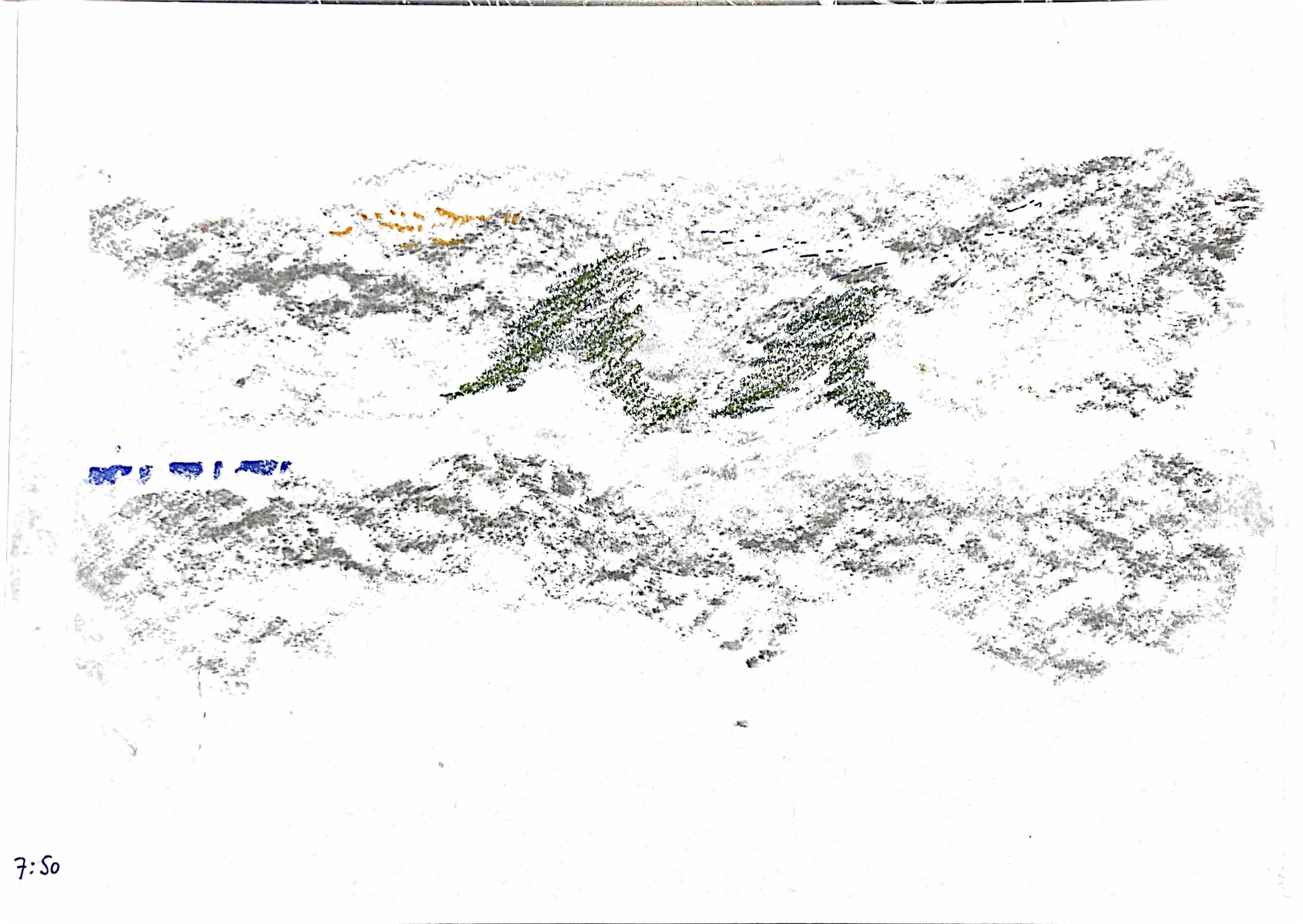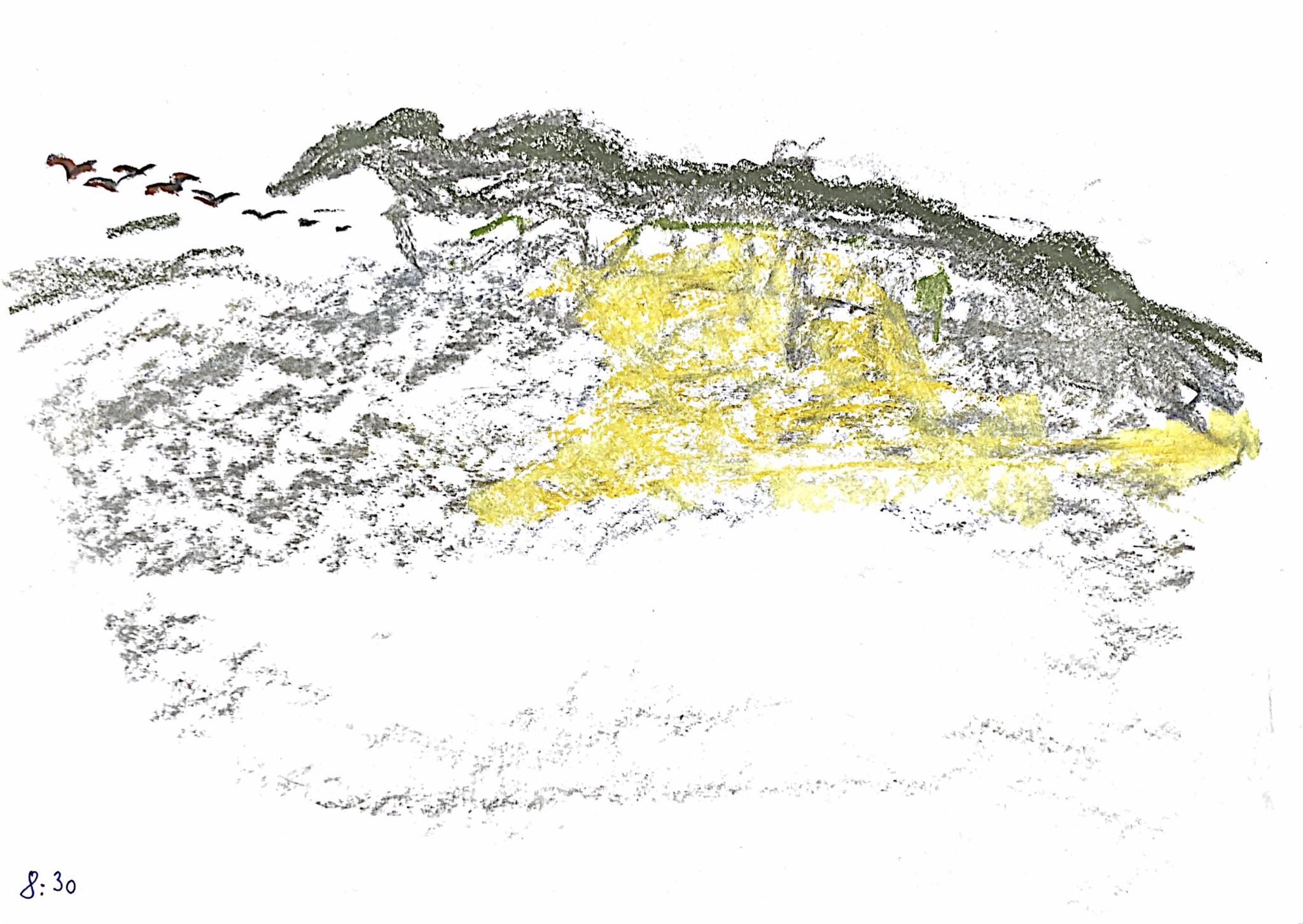 Začal jsem pátrat očima po okolí. Nad námi totiž poletovala čtveřice krkavců, kteří se nejrůznějším způsobem honili mezi sebou a vzájemně se hlasitě dorozumívali. Zjistil jsem, že opět začínám slyšet šum větru, hukot silnice a zvuk jedoucího vlaku. Teď to ale bylo jiné. Všechny tyto kontinuální zvuky jako by se slily v jeden společný neutichající akord. Na protější kopce začalo svítit slunce a já jsem si uvědomil, že již nenaslouchám, ale pozoruji. Poslední stránka skicáku tento moment výstižně zachycuje (s. 10, viz níže).