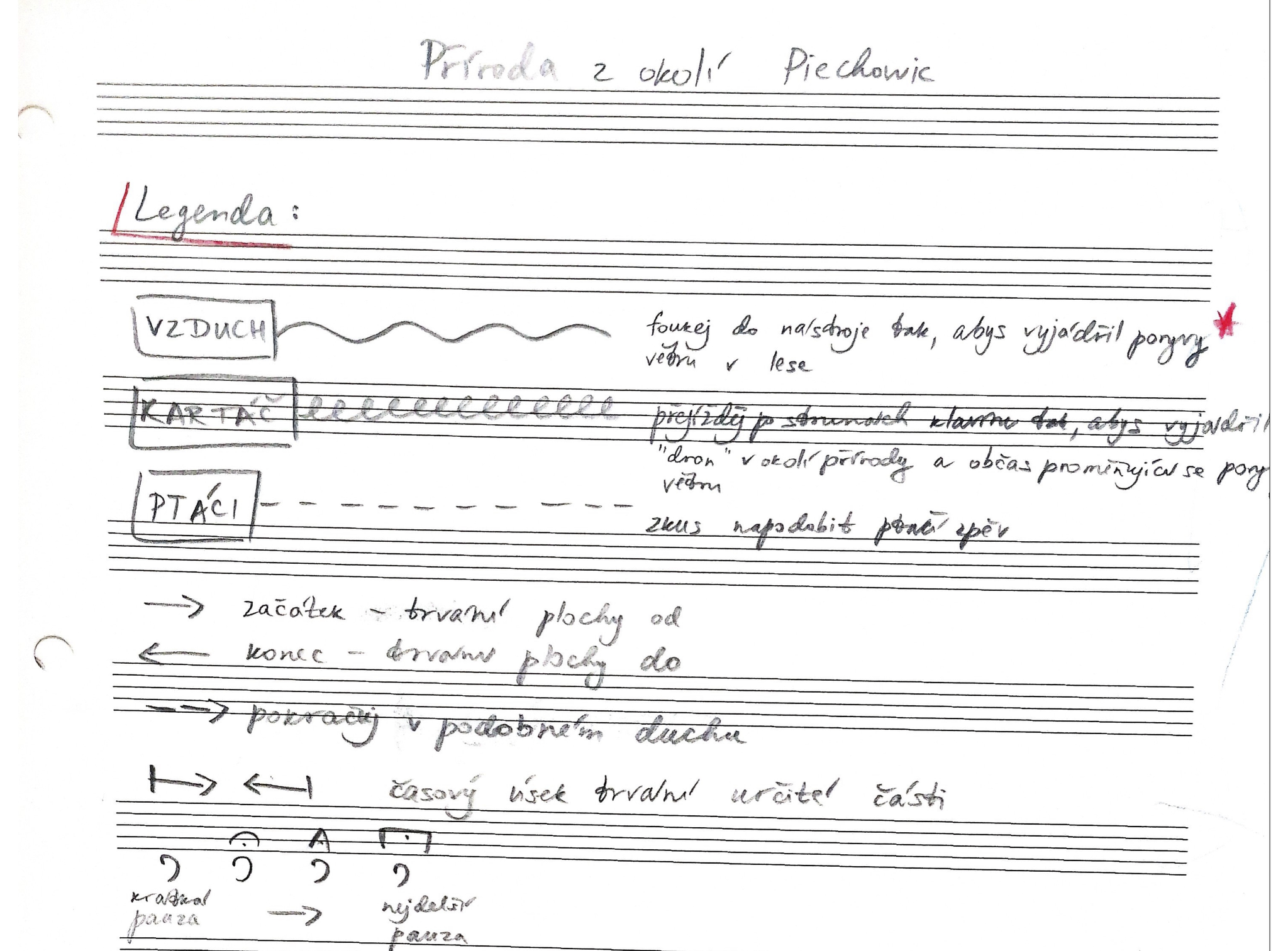 Ptačí melodie byly dalším charakteristickým rysem krajiny. Housle, flétna a klavír si budou tyto „ptačí melodie“ podávat mezi sebou a vzájemně se doplňovat a vést spolu jakýsi dialog. Dále pak upoutal mou pozornost samotný šum lesa. Poryvy větru, které nebyly pravidelné a přicházely nečekaně, a také šumění listí v korunách stromů. Šum listí se mi ale často slil se zvukem silnice. Tento šum lesa bych ráda ztvárnila pomocí foukaní do nástroje v partu flétny a rozmýšlím i nad trombónem. Při zesilování šumu lesa přemýšlím nad využitím hry na struny klavíru k podpoření měnící se intenzity.