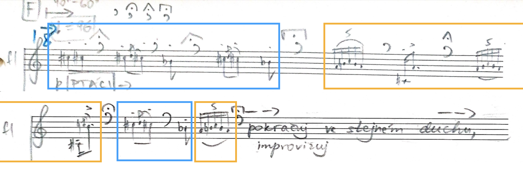 V další fázi hledala možnosti zvukomalebné nápodoby pomocí různých rozšířených technik daného instrumentáře. Flétna a pozoun napodobují foukáním do nástroje poryvy větru. Pozoun staccatissimem v extrémně nízké dynamice chvílemi připomíná vzdálené cvakání kolejí pod projíždějícím vlakem. Stěžejní se v tomto smyslu stal klavír, na nějž se kromě drnkání ve strunách hraje v kompoziční studii i dvěma druhy kartáčů a také plstěnou paličkou. Ukázalo se, že k obsluze všech zmíněných propriet jsou třeba tři osoby, a proto se Kukal Moiseeva rozhodla upustit od původní idey využití houslí a Hořínka hrál místo toho na struny klavíru. Zamýšlený dialog ptačích zpěvů mezi houslemi a flétnou byl přetaven v dialog flétny a drnkání na struny klavíru, který ptačí zpěv teprve připravuje. Flétna následně znázorňuje dialog dvou ptáků sama o sobě (viz obr. 4). Klavír ji napodobuje o oktávu výše jakoby z dálky, neboť struny v této poloze již nemají dusítka, a i když jsou fráze hrány bez pedálu, mají jemný dozvuk. Tato stylizace byla spouštěčem abstraktnějšího uvažování nad formou kompoziční studie.