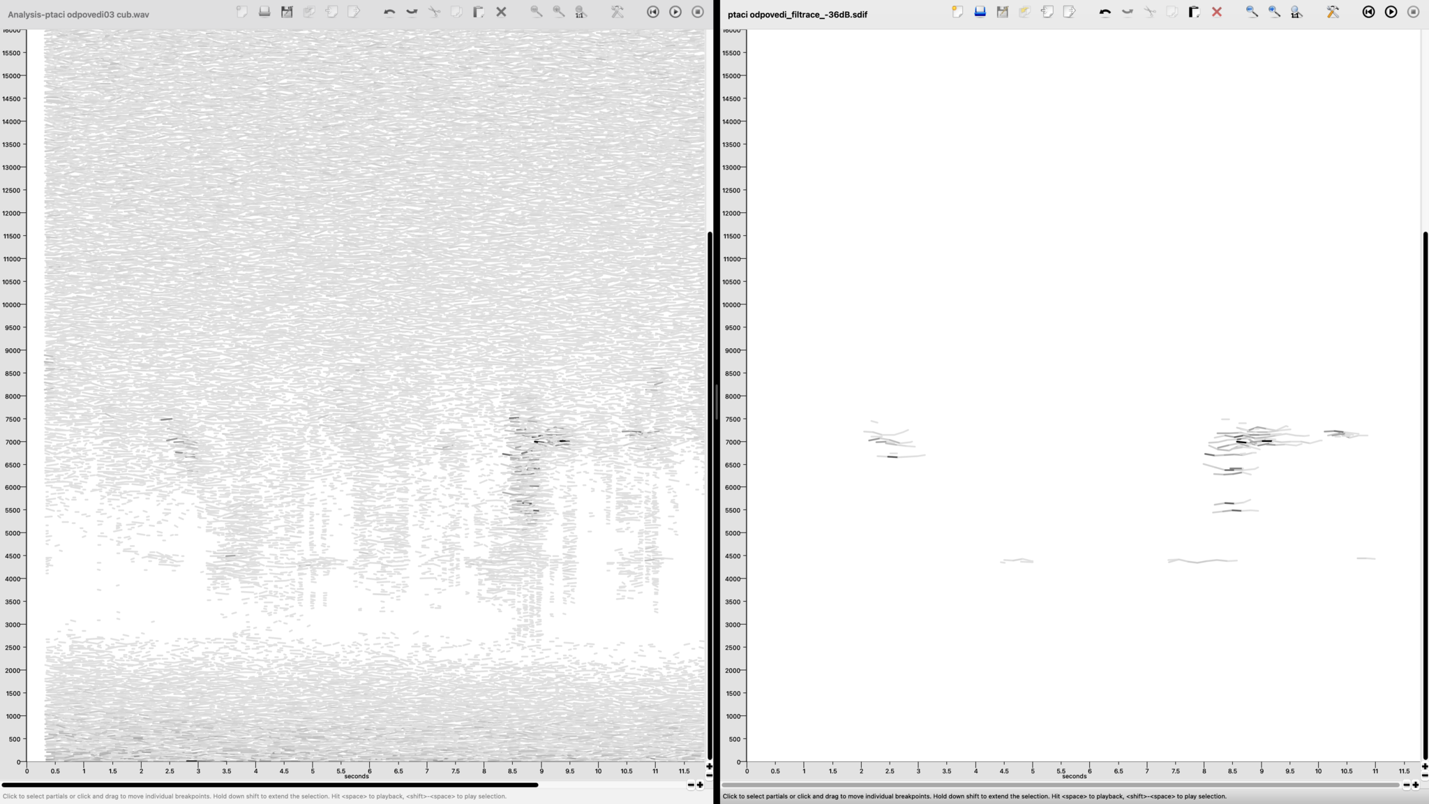 Kukal Moiseeva přistoupila k práci na kompoziční studii velice svědomitě. Nejdříve si schematicky načrtla orientační dramaturgii zvukového průběhu vycházející z její zvukoprostorové zkušenosti. Následně se pokusila analyzovat hlasy ptáků zaznamenané rekordérem, což se ukázalo jako velmi nesnadné, protože většina ptačích volání byla dokonale maskována okolním šumem. Z těch několika, které bylo možné alespoň trochu rozpoznat na nahrávce, se snažila v programu Spear odfiltrovat slabší frekvence (obr. 3).