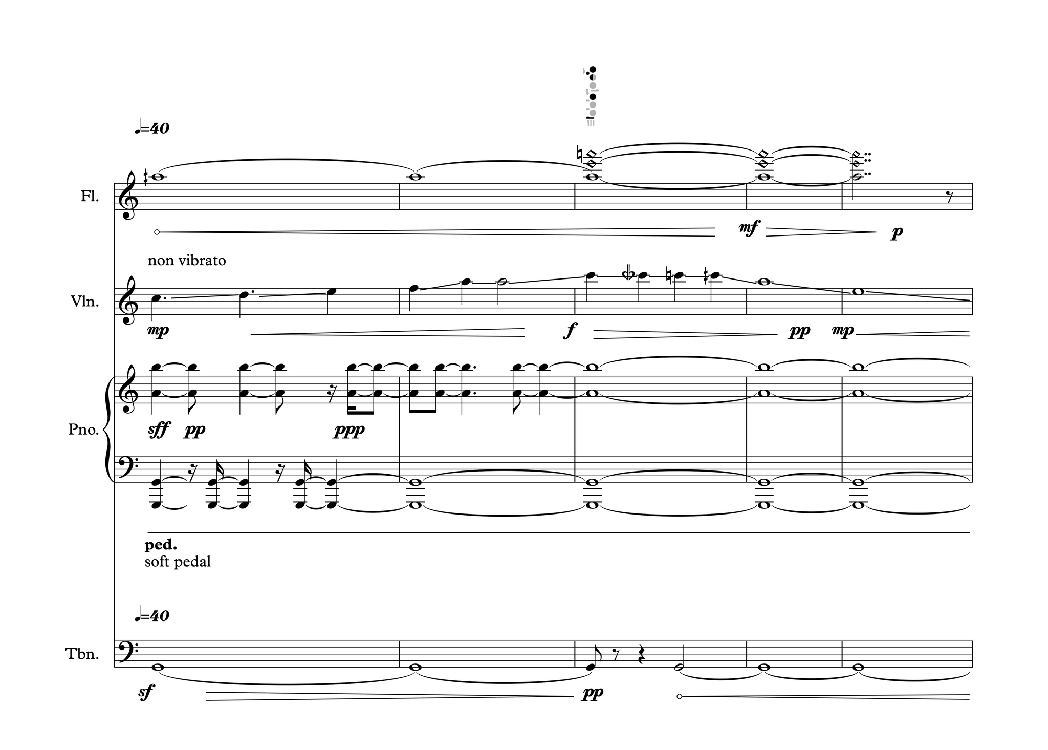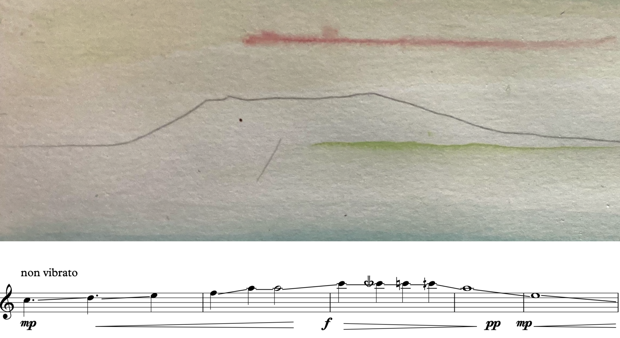 partitury. Jednou vrstvou je melodie, jejíž vývoj vychází ze zakresleného obrysu hor, druhou vrstvou jsou harmonie, které jsou naopak inspirovány plochami, tzn. především barvou… Tyto dvě vrstvy na sobě mají být nezávislé jak dynamicky, tak harmonicky a rytmicky. Skladba bude formálně tvořena sedmi částmi, stejně jako je sedm listů grafické partitury. Vývoj skladby je také určen grafickou partiturou. Spočívá v procesu splynutí vrstev v jednu.