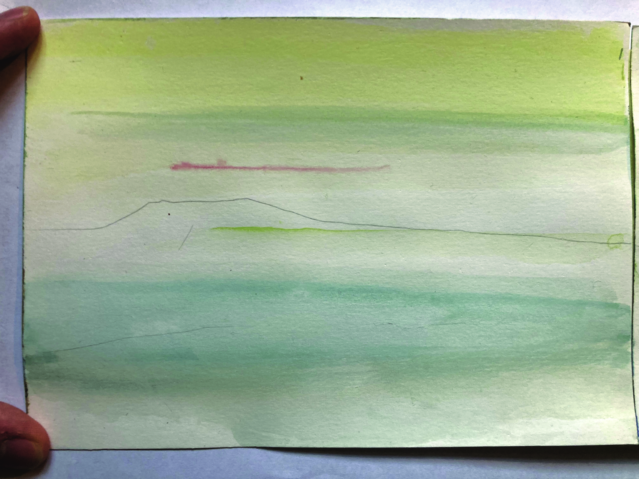 Usadil jsem se na jeden z výčnělků skály, která se tyčila nad údolím. První věc, která upoutala mou pozornost, byly hustě vysázené břízky všude kolem i pod námi. Jejich jemné šustění tvořilo jednu z vrstev krajiny, která se přede mnou rozprostírala. Další výraznou vrstvou byl dron silnice v dálce. Během toho, co jsem na skále seděl, vzniklo sedm skic.21 Po prvním chvilkovém zaujetí celkovým obrazem krajiny jsem se zaměřil na obrysy hor a začal je zakreslovat tužkou. Postupoval jsem od východu na západ. Přes obrys hor jsem akvarelovými barvami namaloval znázornění zvuku krajiny. To, co se ozývalo ve vyšším spektru, jsem umístil do horní části papíru, co v nižším, do spodní části. Jednotlivé zvukové situace jsem navíc barevně odlišil, přičemž intenzita barvy odpovídala hlasitosti zvuku (tento princip však není ve všech skicách dodržen zcela důsledně).