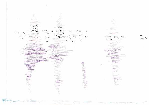 Realizace, která je na nahrávce, představuje jen jednu z nekonečné řady možností. Jiruchova kompoziční studie se nahrávala jako poslední, takže je zřejmé, že interpreti činili své volby v kontextu ostatních skladeb, což ale nebylo autorovou podmínkou nebo výslovným záměrem. Klavír na nahrávce začíná, utváří harmonický terén na základě výše zmíněného tónového výběru. Housle na něj reagují dlouhými tóny, které vycházejí ze zpomaleného volání káně. Flétna vstupuje poslední a hledá přechod mezi šumem a co nejslabším tónem, a to výhradně na hmatech odpovídajících tónovému výběru. Klavír postupně přechází od jednotlivých tónů na rozhraní dvou- a tříčárkované oktávy s dlouhými pauzami mezi frázemi k pravidelně odbíjejícím akordům v rejstříku nižším. Housle taktéž nenápadně klesají, ale délka tónů a hustota dějů v čase se nemění. Flétna zůstává beze změny. Dynamika se pohybuje v rozmezí p–ppp.