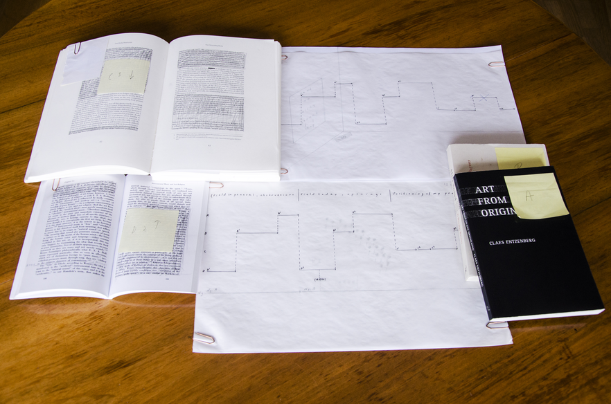 Trying to display my theoretical standpoints, but simultaneously activating them artistically, I created a music score that had the four most influential voices to my project converse. I put them in dialogue chronologically, from the first claims in their books towards their conclusions. I performed the score and tried to claim their voices by reading their words out loud, activating both my sensitivities as musician and researcher. While I was performing the texts, my piece Ng—the starting point (and hypothesis)of my research project—was replayed in headphones that were distributed to the audience. This disposition, at first glance, could be seen as a compartmentalization of the act of artistic research where theory was presented through quotations and books (as in more conventional academia) and the art of the research was presented as a disconnected, at best juxtaposed, part. It was, however, an attempt at showing the mistake of such a compartmentalization. As the two pieces—the one consisting of texts that I was performing live, and Ng replayed from the vinyl disc—corresponded in length and were performed simultaneously the audience constantly had to chose how to interact with the situation. The choice was in their hands whether to focus simply on what was being replayed through the headphones, on what was performed live for them or trying to take part of both expressions at the same time. The scored quotes and books I read commented on the replayed music and vice versa; they would both offer a context to each other where musical sensitivities and a more theoretical standpoint interlocked. This method of presentation is also one where I, in accordance with a general understanding of research, simply compile existing knowledge, as I have not written a single word. My contribution, as I saw it, was artistic and musical in nature; in how I composed this compilation, how I read it and tried it against the replayed Ng. From the first experiment with this method of presentation I further developed it for the following presentations of my artistic research project.