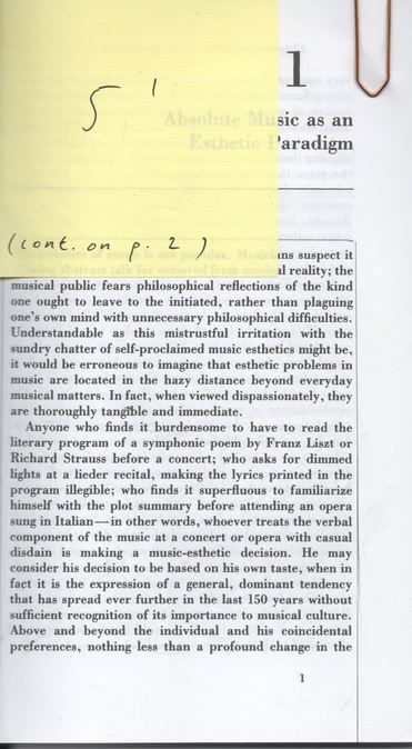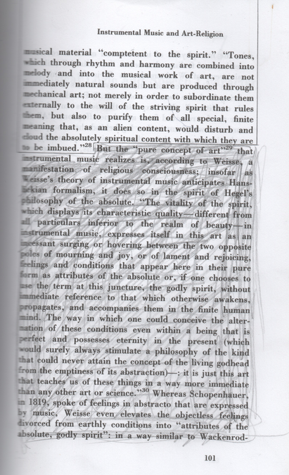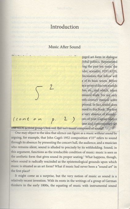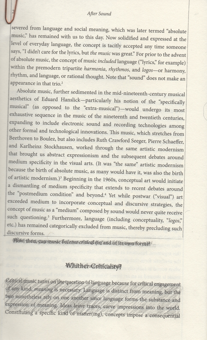 ”Ultimately, through their practices of mobilizing bodies, staging participation, and organizing collectivity, these artists, I argue, deploy forms of composition: they recognize a broader need to put together and assemble, to construct and compose radical forms of commonality. Importantly, this conception of composition departs from the term’s meaning in “new music” institutions—and, moreover, requires a break with sound (art) and absolute music. Such a break is conceivable only by acknowledging the historical finitude of absolute music. Indeed, despite its widespread acceptance, absolute music is to be understood as ahistorical specific concept: it has a determinate beginning, and, as German musicologist Carl Dahlhaus insisted, “What has come about historically can also be changed again.” Such a change could represent a radical shift in musical thinking and practice. Music could become untethered from sound as an autonomous medium, left, at an extreme, without sound […]Sound could be deprioritized in favor of the wider methodological scope necessary to formulate music as a critical art practice. No longer adherent to the primacy of sound, this “music beyond sound” could finally become a music after sound“ (Berrett, 2016, p. 6).