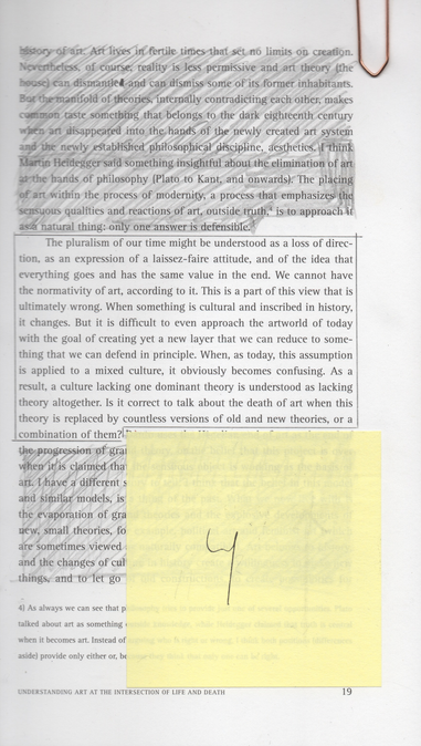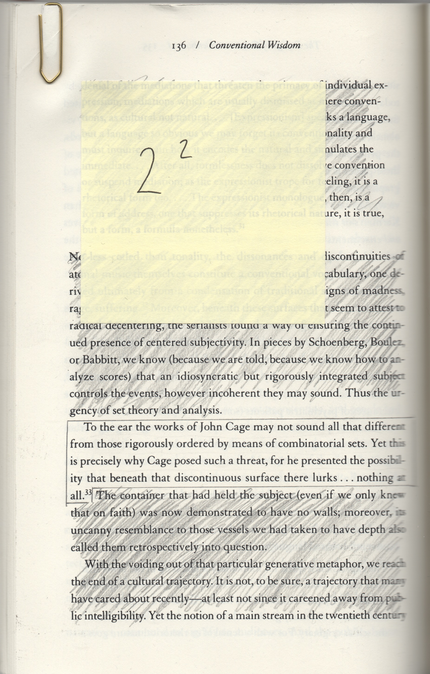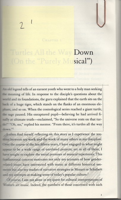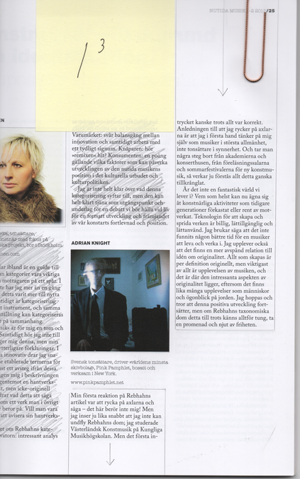 1) though I have tried to avoid it, I realize that I display tendencies of eclecticism in this written account of my artistic research, this reflection, as it were. These tendencies could be symptoms of over reaching, trying to have my research relate to too many music genres and theories, but it could also—more emphatically—be seen as a delineation of sorts in attempting to explain what I try to do by showing what I do not. Would it have been preferable if I would have given an efficient explanation of exactly where to put my music in a canon that today seems to have collapsed? Trying to explain myself more theoretically, I again lean on the writings of Claes Entzenberg (with the risk of becoming redundant): “ …the development from the sixties onwards is what makes history (of art) difficult to write: I do not think that we can find many people, if any, that can give us a correct map of art” (Entzenberg, 2013, p. 20). If I am to try and understand the art—or music—world today it seems to me that efficiency through historical and canonical ratios alone simply does not cut it. Then again, Entzenberg goes on to write that: “…this is not an effort to create something that can be seen as a sort of illusive freedom for all artists” (Entzenberg, 2013, p. 20). And: “We must have theory, but not one grand theory. We have an object/event but without context we cannot tell anymore whether it is art” (Entzenberg, 2013, p. 20). Though we have arguably already moved beyond the postmodern period, I believe that what Susan McClary writes on the matter is still of interest: