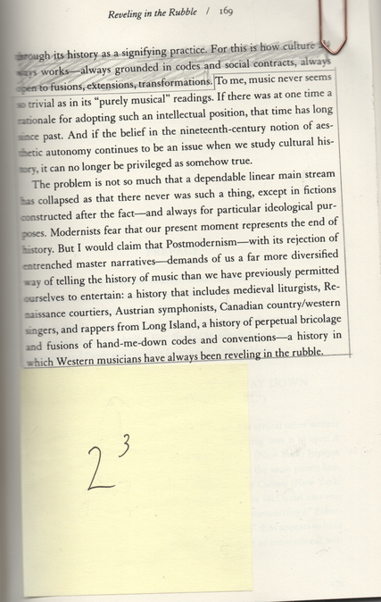 …I would claim that Postmodernism—with its rejection of entrenched master narratives—demands of us a for more diversified way of telling the history of music than we have previously permitted ourselves to entertain: a history that includes medieval liturgists, Renaissance courtiers, Austrian symphonists, Canadian country/western singers, and rappers from Long Island, a history of perpetual bricolage and fusions of hand-me-down codes and conventions—a history in which Western musicians have always been reveling in the rubble (McClary, 2000, p.169).