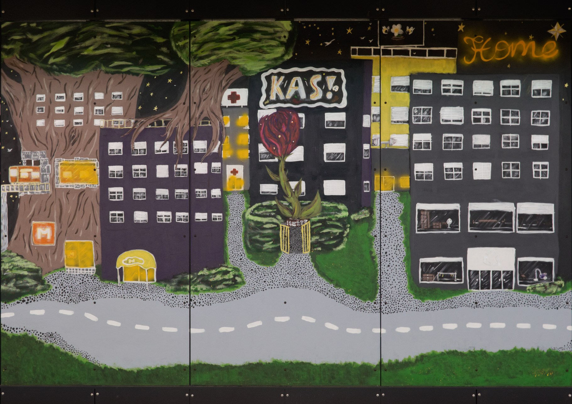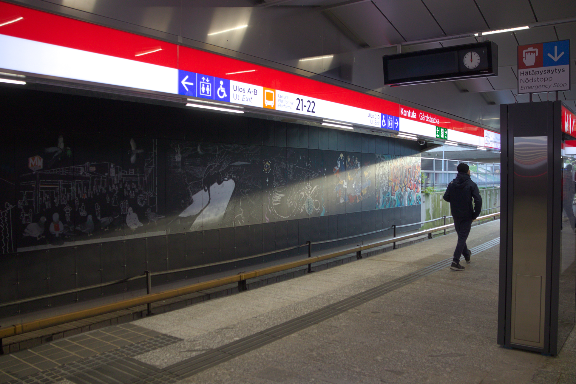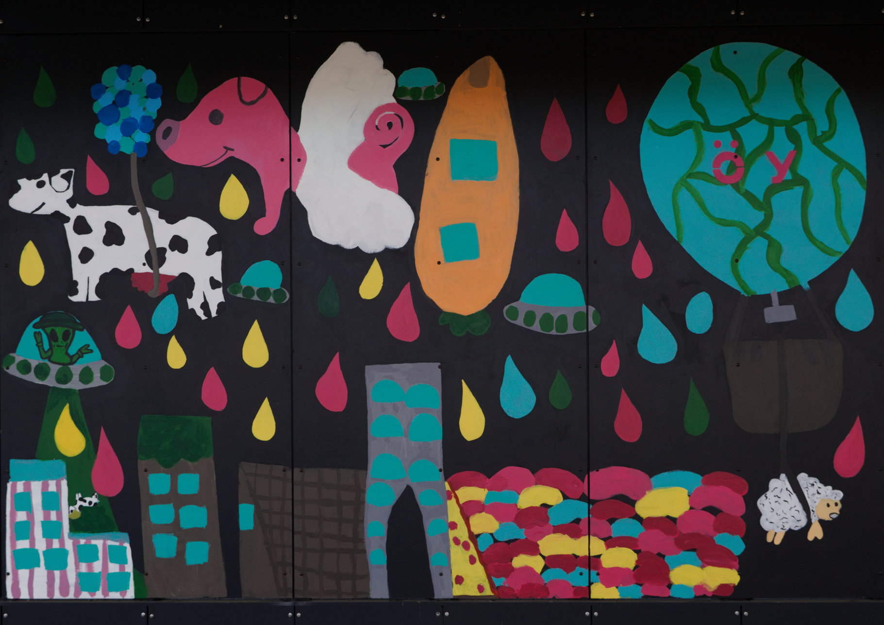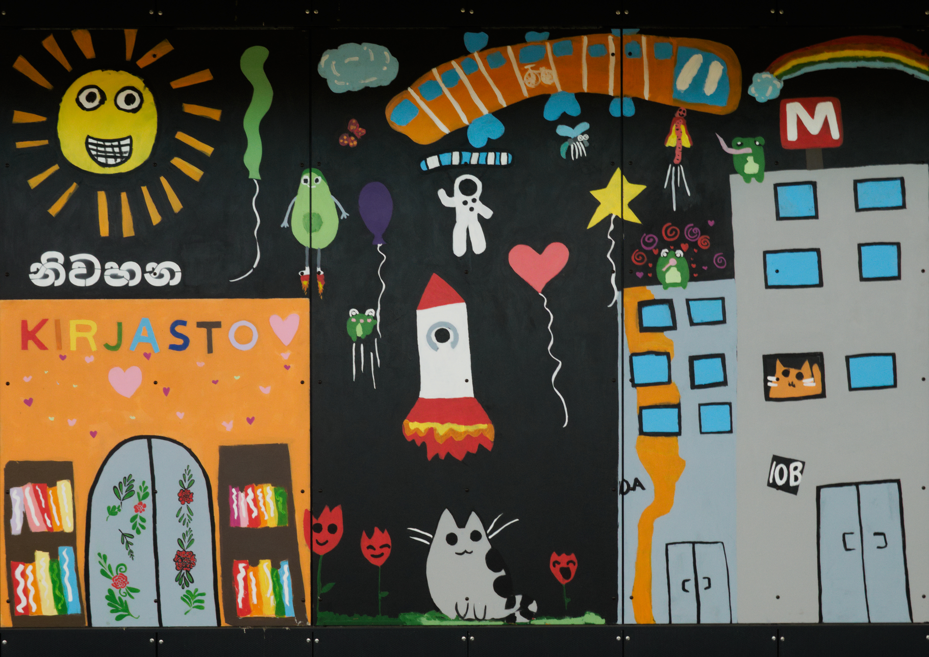 Heidi Hanninen, Academy of Fine Arts / Uniarts Helsinki, 5th year Doctoral student Artistic research: KAS! Kontula Art School – socially engaged public art Possibilities of the community art in culturally diverse contexts In this photo gallery you can take a look inside to KAS! Kontula Art School's socially engaged public art practice through the last artistic part of the artistic research by community artist-researcher Heidi Hänninen. "Kaupunki on meidän koti" ("City is our home") art work includes paintings from 36 KAS community members implemented for the renovated metro station in Kontula suburb. Both sides of the walls by the metro rails were covered by art: other side with the paintings by 18 adults from KAS collective and the other side by KAS Juniors (age 8-19 years). Juniors paintings include word HOME in 29 different languages locally spoken at homes and by friends and relatives of these kids and youngsters involved. Some of the languages are such that our juniors would like to know better or are already learning. In my artistic research initiated in 2021 I focuse on questions about ethically sensitive community art practice in the context of my ongoing project called KAS! Kontula Art School, socially engaged street art project, that I started in 2019 in suburban district Kontula in Eastern Helsinki. The aim of The Kontula Art School is to implement interesting public art but also to strengthen the community spirit and contribute to reduce potential conflicts in the region. Kontula is one of the most vivid, multilingual and culturally rich suburbs in Finland with the income level lower than the average. Kontula has been well known, especially among the media, for drugs used and sold around the shopping mall. The area is conflict sensitive and challenging but also a ground for experimenting new kinds of social / artistic realities and for the birth of communal practices far from the conventional borders and definitions. KAS! project has been cooperating with the local low threshold day center Symppis, where many of the customers have dual diagnosis (issues with both substance use and mental health). The participants of highly heterogeneous Kontula Art School consists of both adults and children. Participants represent various cultures, including substance use cultures. Some of the participants have educational background in arts but majority of them have been self taught. KAS! project has been involving artistically motivated people, regardless of their background, status or the life situation. Through the art making process I have had access to build ethically sensitive methodological toolkit for community art practices in culturally diverse contexts in a changing urban environment like Kontula, where understanding about good life varies greatly between its residents. Art creates possibilities for encountering and helps to break stigmas concerning certain groups of people. From the point of view of “Rebellious Research” (Ryynanen & Suoranta 2016) the world of art has crucial role in the process of fostering wellbeing of people and the justice in our shared society; art can reconstruct thinking and sometimes even the whole life of an individual. The key element in activist art is the act of participating, and questions like how people take part of the process and how does the act of process participates politically arise. (Suoranta & Ryynanen 2016, p. 235) In my study (street) art practice is the method of working and collecting research material (socially engaged art making practice and ready artworks in the public environment) but it is also an intervention for the (social) change. Through this research I suggest that socially engaged art interventions similar to KAS practice can empower both, the authors of the public art works and the whole surrounding community in a unique way, especially when used through the heterogeneous group context. KAS! practice is bringing up critical perspective concerning issues about public art and artistic experience of the urban environment by creating new directions to debate questions related to the community art, artistry, and the nature and possibilities of art itself in this changing world among those new realities that we share and shape together to be lived in. text: Heidi Hänninen (2025) photos: Tanguy Gérôme (2025)