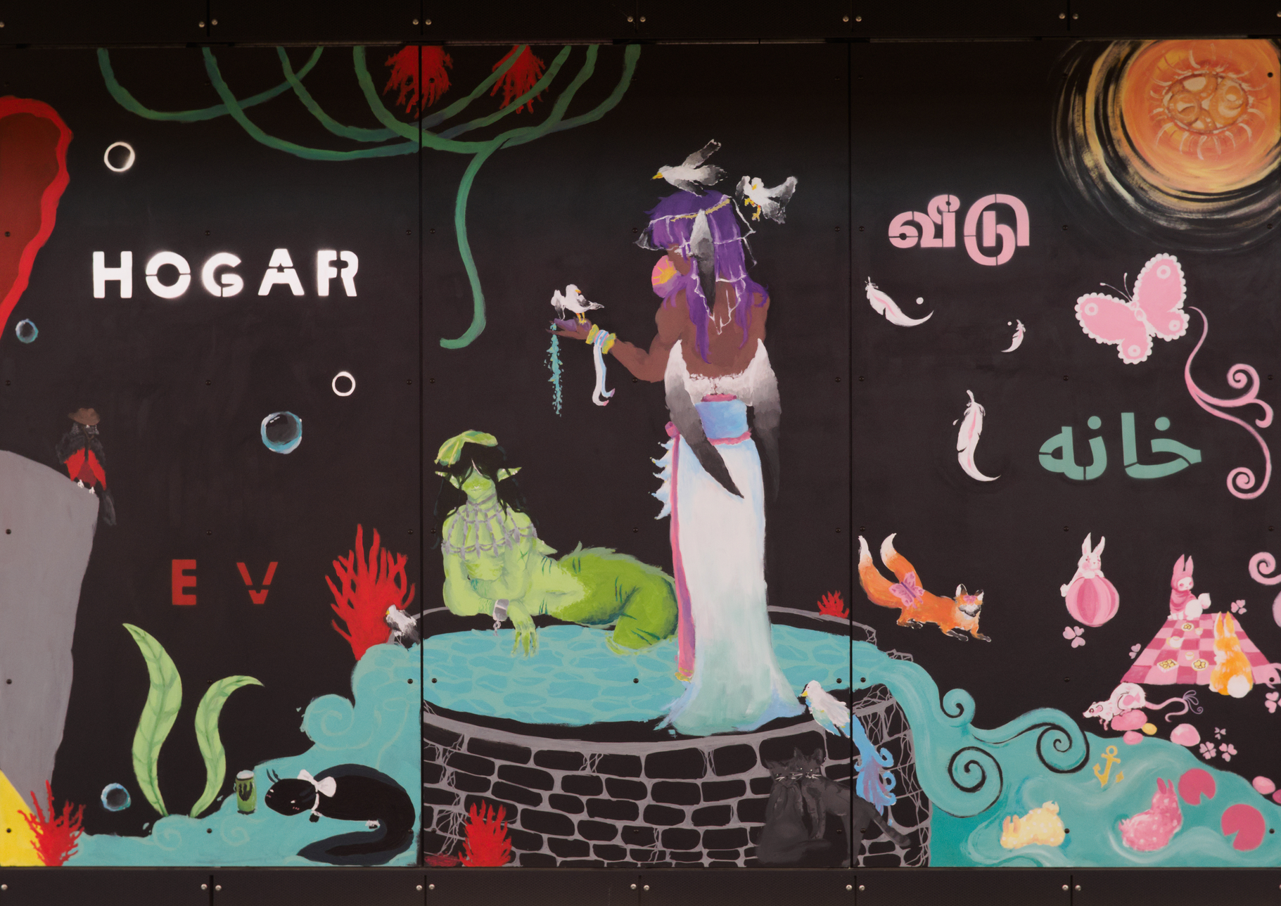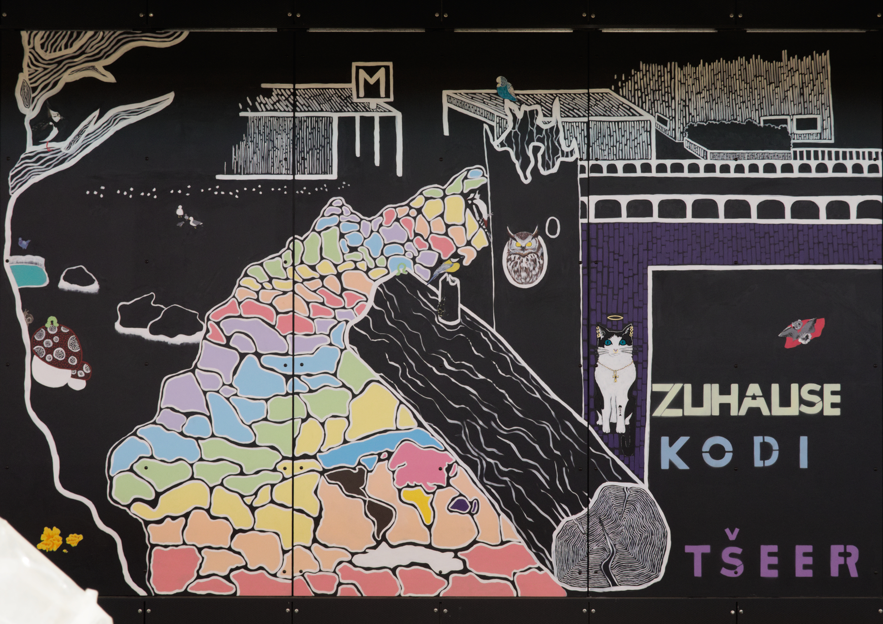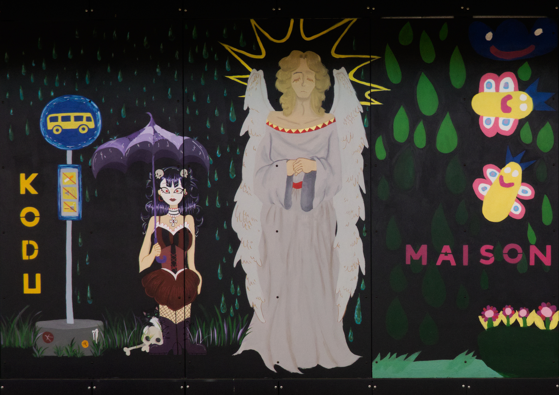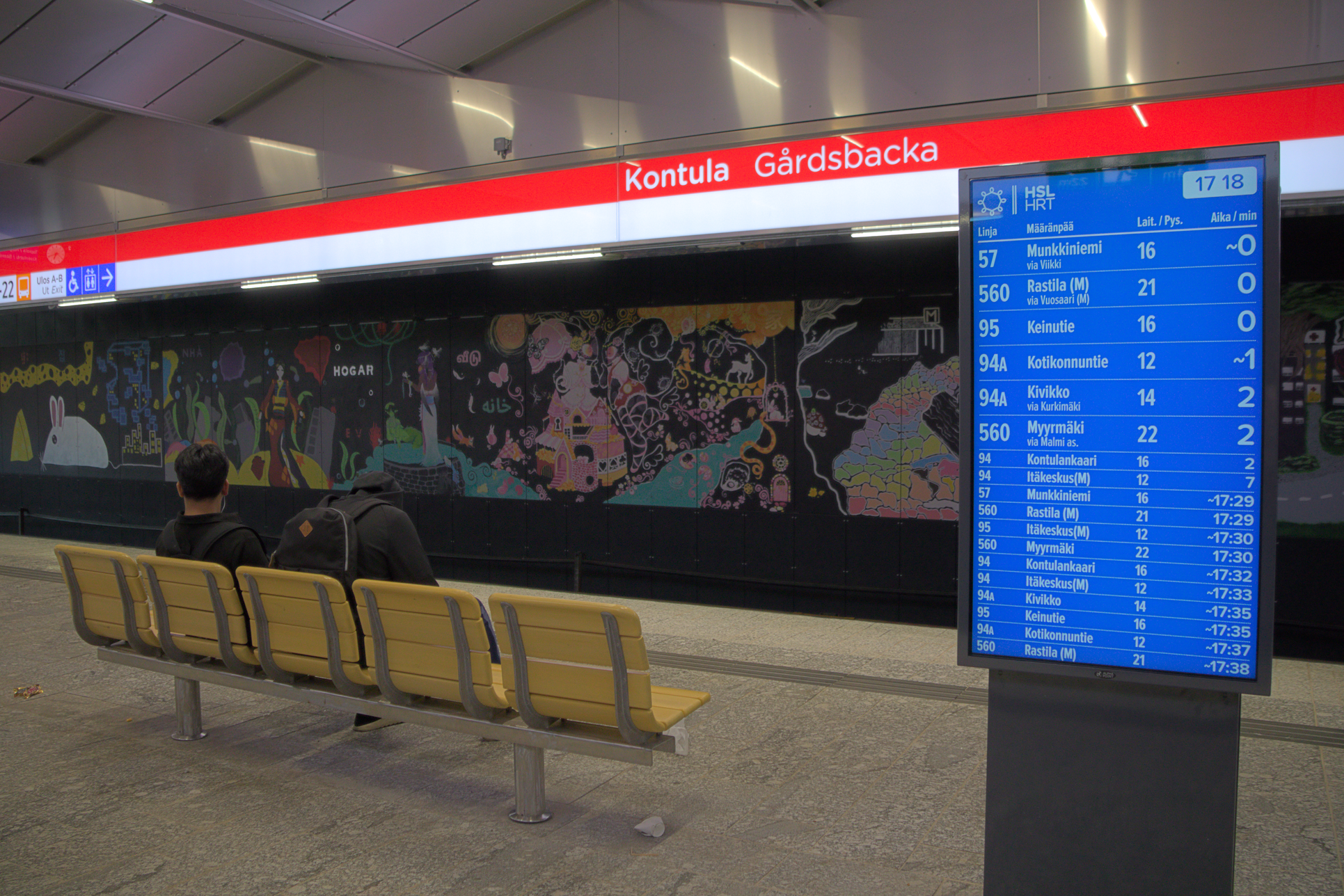 Heidi Hanninen, Academy of Fine Arts / Uniarts Helsinki, 5th year Doctoral student Artistic research: KAS! Kontula Art School – socially engaged public art Possibilities of the community art in culturally diverse contexts In this photo gallery you can take a look inside to KAS! Kontula Art School's socially engaged public art practice through the last artistic part of the artistic research by community artist-researcher Heidi Hänninen. "Kaupunki on meidän koti" ("City is our home") art work includes paintings from 36 KAS community members implemented for the renovated metro station in Kontula suburb. Both sides of the walls by the metro rails were covered by art: other side with the paintings by 18 adults from KAS collective and the other side by KAS Juniors (age 8-19 years). Juniors paintings include word HOME in 29 different languages locally spoken at homes and by friends and relatives of these kids and youngsters involved. Some of the languages are such that our juniors would like to know better or are already learning. In my artistic research initiated in 2021 I focuse on questions about ethically sensitive community art practice in the context of my ongoing project called KAS! Kontula Art School, socially engaged street art project, that I started in 2019 in suburban district Kontula in Eastern Helsinki. The aim of The Kontula Art School is to implement interesting public art but also to strengthen the community spirit and contribute to reduce potential conflicts in the region. Kontula is one of the most vivid, multilingual and culturally rich suburbs in Finland with the income level lower than the average. Kontula has been well known, especially among the media, for drugs used and sold around the shopping mall. The area is conflict sensitive and challenging but also a ground for experimenting new kinds of social / artistic realities and for the birth of communal practices far from the conventional borders and definitions. KAS! project has been cooperating with the local low threshold day center Symppis, where many of the customers have dual diagnosis (issues with both substance use and mental health). The participants of highly heterogeneous Kontula Art School consists of both adults and children. Participants represent various cultures, including substance use cultures. Some of the participants have educational background in arts but majority of them have been self taught. KAS! project has been involving artistically motivated people, regardless of their background, status or the life situation. Through the art making process I have had access to build ethically sensitive methodological toolkit for community art practices in culturally diverse contexts in a changing urban environment like Kontula, where understanding about good life varies greatly between its residents. Art creates possibilities for encountering and helps to break stigmas concerning certain groups of people. From the point of view of “Rebellious Research” (Ryynanen & Suoranta 2016) the world of art has crucial role in the process of fostering wellbeing of people and the justice in our shared society; art can reconstruct thinking and sometimes even the whole life of an individual. The key element in activist art is the act of participating, and questions like how people take part of the process and how does the act of process participates politically arise. (Suoranta & Ryynanen 2016, p. 235) In my study (street) art practice is the method of working and collecting research material (socially engaged art making practice and ready artworks in the public environment) but it is also an intervention for the (social) change. Through this research I suggest that socially engaged art interventions similar to KAS practice can empower both, the authors of the public art works and the whole surrounding community in a unique way, especially when used through the heterogeneous group context. KAS! practice is bringing up critical perspective concerning issues about public art and artistic experience of the urban environment by creating new directions to debate questions related to the community art, artistry, and the nature and possibilities of art itself in this changing world among those new realities that we share and shape together to be lived in. text: Heidi Hänninen (2025) photos: Tanguy Gérôme (2025)
