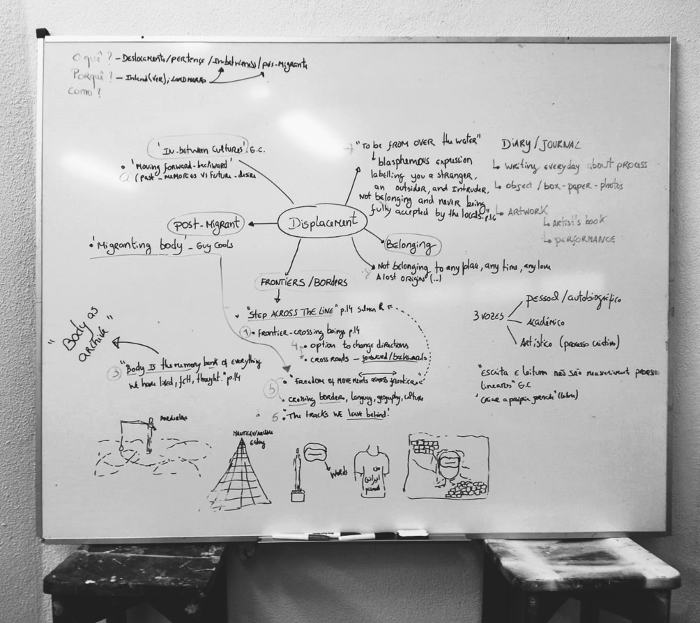 Este projeto apresenta-se como uma investigação em arte, com base na prática artística, entendida como espaço de reflexão crítica sobre identidade, corpo, (pós)migração, território, fronteiras, deslocamento e arquivo. Através de uma abordagem transcultural, pretende-se refletir sobre os dois territórios que fazem parte da minha identidade – Portugal e Irão. O ponto de partida é a minha experiência pessoal, enquanto cidadã portuguesa-iraniana, pós-migrante. Embora a pesquisa parta da revisitação autobiográfica, é com a análise crítica da recensão ao conhecimento, de arquivos institucionais e privados, micro-histórias da comunidade diaspórica iraniana e de outras práticas artísticas contemporâneas, com interesse pelas artes plásticas e pela performance art, que o corpo de trabalho ganhará força para constituir uma visão mais coletiva, tendo como foco central o corpo performativo. Pretende-se assim refletir também sobre o modo como o corpo pode funcionar enquanto arquivo vivo de uma identidade in-between. Alinhando com conceitos definidos por autores como Guy Cools, Hamid Dabashi, Homi Bhabha, Leila Ahmed, Salman Rushdie ou Zygmunt Bauman, a investigação propõe uma leitura do corpo enquanto território liminar, um espaço simbólico, político e poético onde se manifestam as dinâmicas do “Terceiro Espaço”, da encruzilhada e do deslocamento identitário. Através desta abordagem especulativa, procura-se compreender de que modo as experiências diaspóricas e as identidades in-between se projetam na criação artística contemporânea, propondo o corpo como lugar ativo de resistência, mediação e inscrição de memória.
