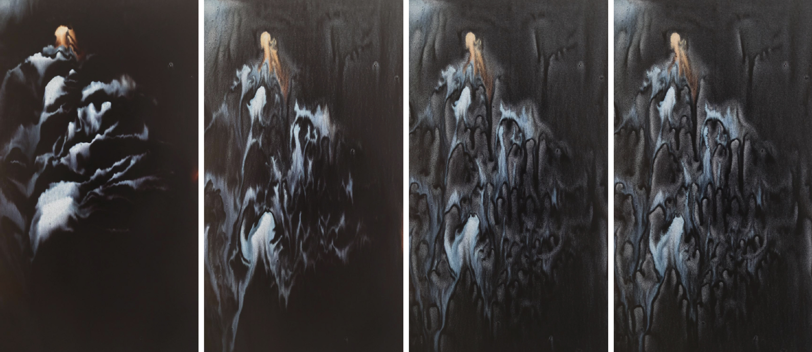 Mergulho em Apneia parte da decomposição prolongada de fotografias ao longo de dois anos. Ao contrário da decomposição em tempo real de 30 minutos de matéria, aqui as imagens foram deixadas à ação do tempo físico e ambiental, sem qualquer mediação tecnológica, permitindo que a deterioração da tinta e do papel se acumulasse lentamente. O resultado é um conjunto de imagens quase irreconhecíveis, manchadas, cujos contornos apenas sugerem memórias visuais difusas.