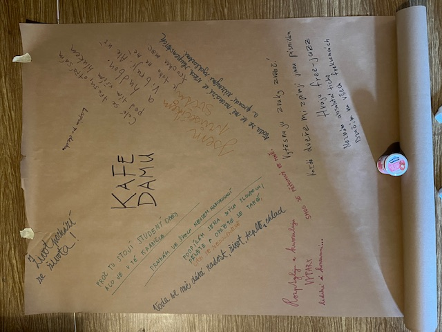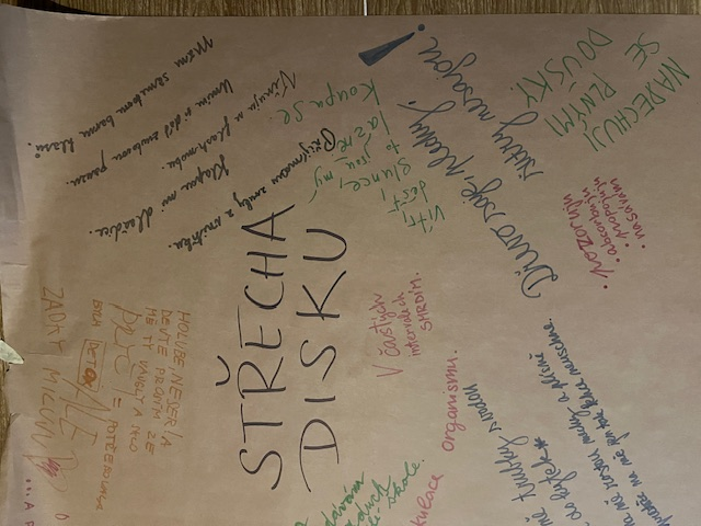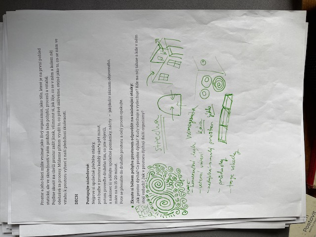 This exhibition presents the context, process, and conclusions of the artistic research project Imagination as a Tool for Change in Shared Space, carried out at DAMU. At the heart of the research is the question: How can we give the body a voice? In other words, how can we invite bodily perception and imagination into the process of decision-making and exploration, while at the same time perceiving these qualities as fully-fledged mediators of information? The backbone of the research consists of a pair of workshops designed to guide students through the exploration and reflection on the theme of the chill zone at DAMU. A series of exercises aimed to awaken their somatic and sensory perception, followed by an exploration of spaces designated for rest, and finally imaginative exercises with the aim of proposing possible changes or forms for the spaces. The exhibition presents the individual layers of the project: 1) In the contextual layer, we acquaint readers with our personal starting points (chapter: Medallions), with the theoretical and practical-experiential foundations on which we consciously build (chapter: Introduction), and with methodological procedures (chapter: Methodology). 2) At the center is the documentary layer, which describes the structure of the workshops, the creative outputs of the participants, and a chronicle mapping the transformation of the research team's thinking, documenting the lively dialogue between the discourses of transformative pedagogy and embodied learning in acting and authorship. 3) The layer of findings and conclusions identifies two fundamental qualities: (a) the concept of "sensitized researchers", in which bodily and sensory perception provides a full report on the surrounding world, and (b) the situation of being in the imagery, in which working with the imagination offers possible proposals for change. In conclusion, we look back at the reasons for the changes in the original research questions and consider further possible directions for research. Tato expozice prezentuje kontext, proces a závěry uměleckého výzkumu Imaginace jako nástroj změny ve sdíleném prostoru realizovaného na DAMU. V centru výzkumu stojí otázka: Jak dát tělu hlas? Neboli jak do procesu rozhodování a zkoumání přizvat tělesné vnímaní a imaginaci a jak zároveň tyto kvality vnímat jako plnohodnotné zprostředkovatele informací. Páteř výzkumu tvoří dvojice workshopů, které byly navrženy tak, aby studující provedly zkoumáním a promýšlením tématu chill-zóny na DAMU. Série cvičení směřovala k probuzení jejich tělesné a smyslové vnímavosti, následně ke zkoumání prostor určených pro odpočinek a v závěru k imaginativním cvičením s cílem navrhnout možné změny či podobu prostor. Expozice představuje jednotlivé vrstvy projektu: 1) V kontextová vrstvě seznamujeme čtenáře s našimi osobními výchozími pozicemi (kap. Medailonky), s teoretickými a prakticko-zkušenostními východisky, na které vědomě navazujeme (kap. Úvod), a s metodologickými postupy (kap. Metodologie). 2) V centru stojí dokumentární vrstva přibližující strukturu workshopů, kreativní výstupy účastnictva a kroniku mapující proměnu myšlení výzkumného týmu, dokládající živý dialog mezi diskurzy transformativní pedagogiky a vtěleného učení k herectví a autorství. 3) Vrstva zjištění a závěrů identifikuje dvě zásadní kvality: (a) koncept „zcitlivělé výzkumnictvo“, kdy tělesné a smyslové vnímání přináší plnohodnotnou zprávu o okolním světě, a (b) situaci bytí v představě, kdy práce s imaginací nabízí možné návrhy ke změně. V závěru se ohlížíme za důvody změn původních výzkumných otázek a promýšlíme další možné směřování výzkumu.
