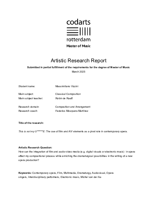 This research explores the integration of film as a dramaturgical element within contemporary opera, with a specific focus on its role in shaping narrative, character development, and audience perception. Over the course of two years, I have investigated the compositional and theatrical possibilities that emerge when opera, A/V elements and film interact, aiming to expand the expressive potential of these mediums. Structured in three different cycles, this paper examines the evolving relationship between live musical performance, electronic music composition, and visual storytelling. Through a combination of desk research, artistic experimentation, and practical composition—drawing insights from the creative processes of composers such as Michel van der Aa, Richard Ayres, Sivan Eldar, and others—this research highlights the challenges and opportunities of hybrid opera-film formats. The findings demonstrate that film can serve not only as an aesthetic addition but as a fundamental component of dramaturgy, capable of deepening character psychology and reinforcing musical structures. Additionally, the research reveals the complexities of balancing digital and organic elements in opera, contributing to a broader understanding of contemporary music-theater composition. Through this process, I gave myself the freedom to experiment as much as possible and learn by observing from composers and artists who stimulated and inspired my creativity. As a result, this paper has culminated in the development of This is not my U******E (2024-2025), a new opera production for soprano, baritone, sinfonietta and A/V elements.