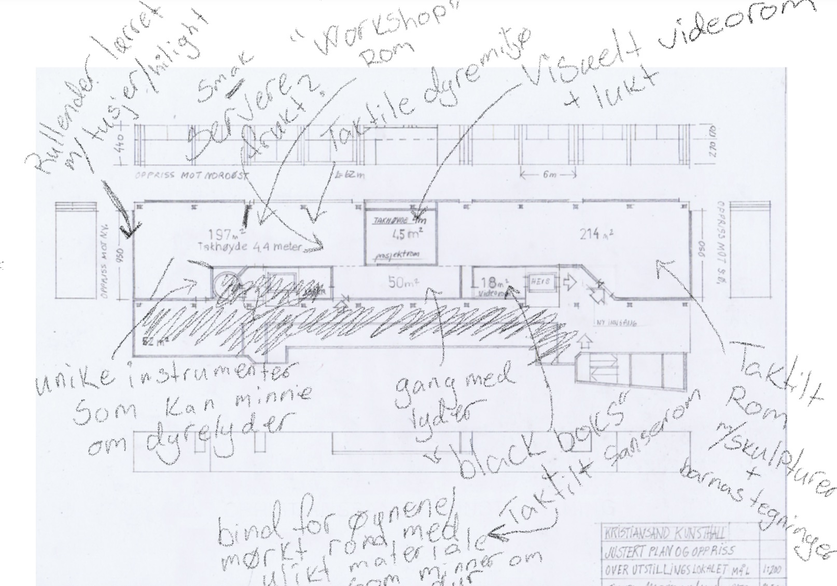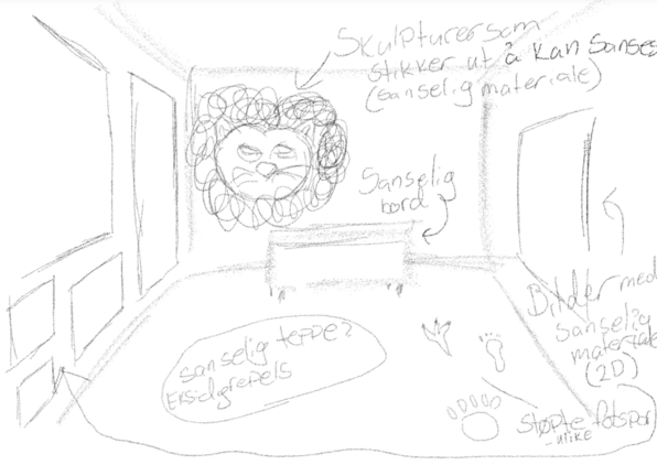 Det starter i et taktilt og visuelt rom med skulpturer av barns tegninger som er realisert av lokale kunstnere. Rommet fylles med flere skulpturer i ulike høyder og fasonger. Veggene vil vise flere av de originale tegningene barnehagebarna har laget.