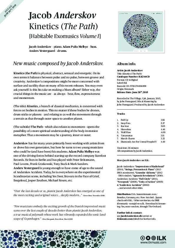 Kinetics (the Path) – Habitable Exomusics Volume I – was recorded at The Village, Copenhagen, January 2015. Released 26 June 2015 on ILK.
