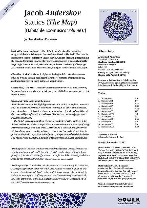Statics (the Map) – Habitable Exomusics Volume II was recorded at Rainbow Studio, Oslo, December 2014. Released 21 August 2015, on ILK.