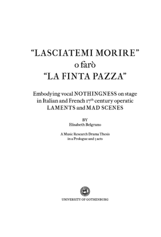 This music research drama thesis explores and presents a singer’s artistic research process from the first meeting with a musical score until the first steps of the performance on stage. The aim has been to define and formulate an understanding in sound as well as in words around the concept of pure voice in relation to the performance of 17th century vocal music from a 21st century singer’s practice-based perspective with reference to theories on nothingness, the role of the 17th century female singer, ornamentation (over-vocalization) and the singing of the nightingale. The music selected for this project is a series of lamentations and mad scenes from Italian and French 17th century music dramas and operas allowing for deeper investigation of differences and similarities in vocal expression between these two cultural styles.