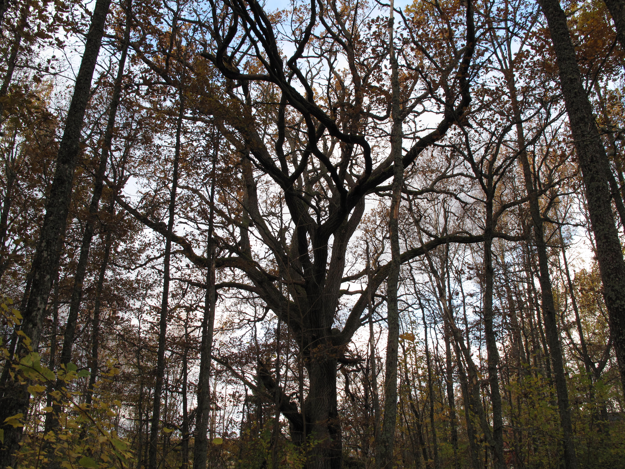 Ensimmäinen tammipuu, sitä on vaikea ohittaa ilman, että menisi lähemmäs tarkastelemaan sitä. Se on sellainen mahtipuu, satujen peruskamaa, ajattelen. Puu muistuttaa takajaloilleen noussutta karhua, käsivartena paksut vääntyneet oksan tyngät, jotka jyrisevien salamoiden välähdyksien lailla levittävät oksanhaaroja. Sen runko on melkein pienen vajan kokoinen ja siitä on iso kaarnan liuska irronnut, vähän liikahtanut paikoiltaan. Liuska on pienen oven kokoinen, sellainen, josta pitää mennä sisään hieman kumartuneena, ettei pää osuisi oven karmiin. Puu kasvaa pienen rinteen juurella lähellä pellon rajaa. Ennen kuin pääsee puun juurelle, on pitänyt ohittaa kivikasat, ehkä ne on pelloilta raivattu aikoinaan ja arveltu, että näistä voisi rakentaa kiviaita. Loiva rinne on tiiviin aluskasvillisuuden peittämä. Tarkkailen maastoa, pensaiden seasta on hankala kulkea, koska lanka tarttuu oksiston teräviin piikkeihin. Ei hätää, mennään hitaasti, lanka löytää väylänsä polveillen aluskasvillisuuden kannattelemana ja paikoitellen kadoten lehtien raoista.