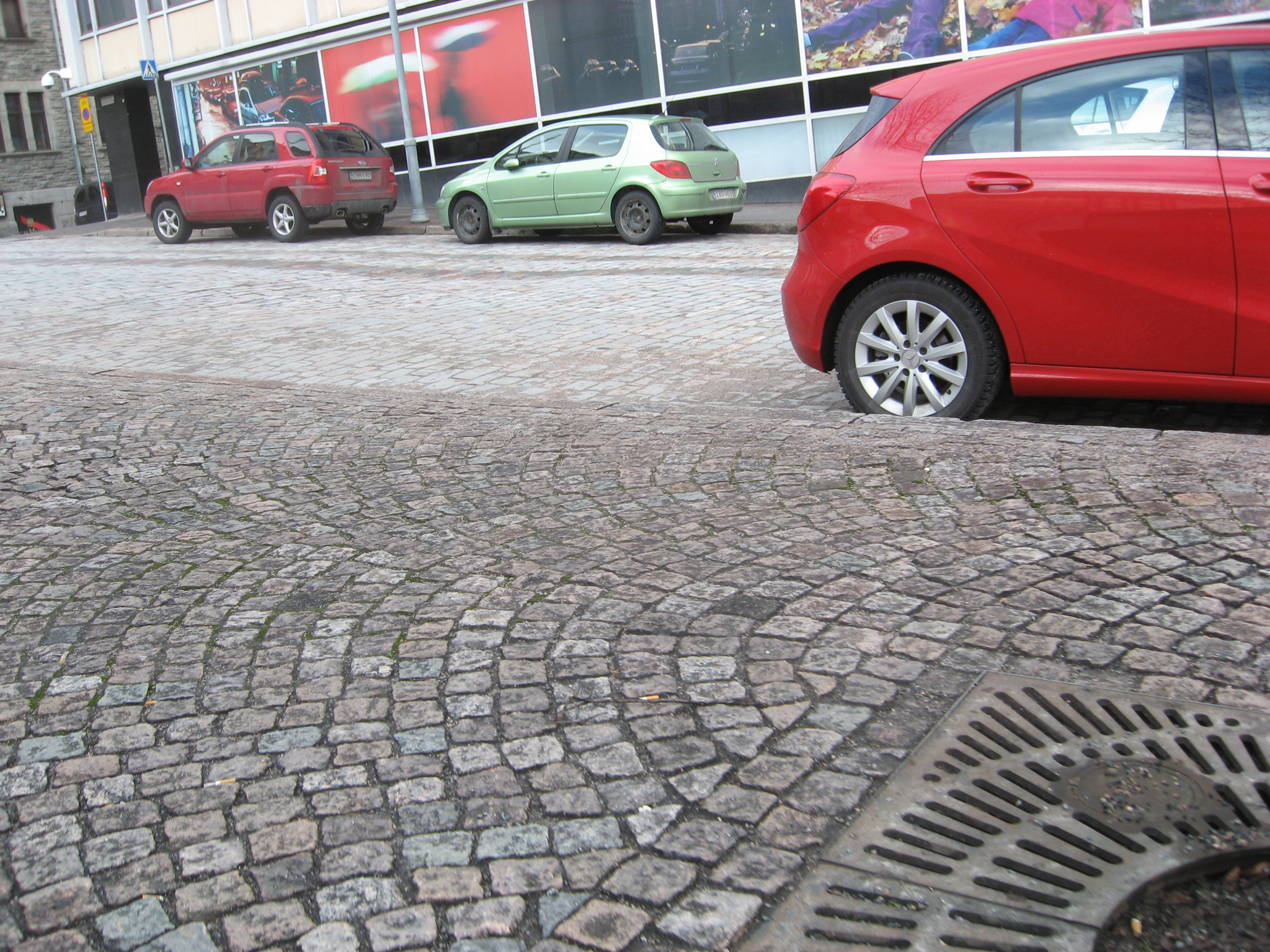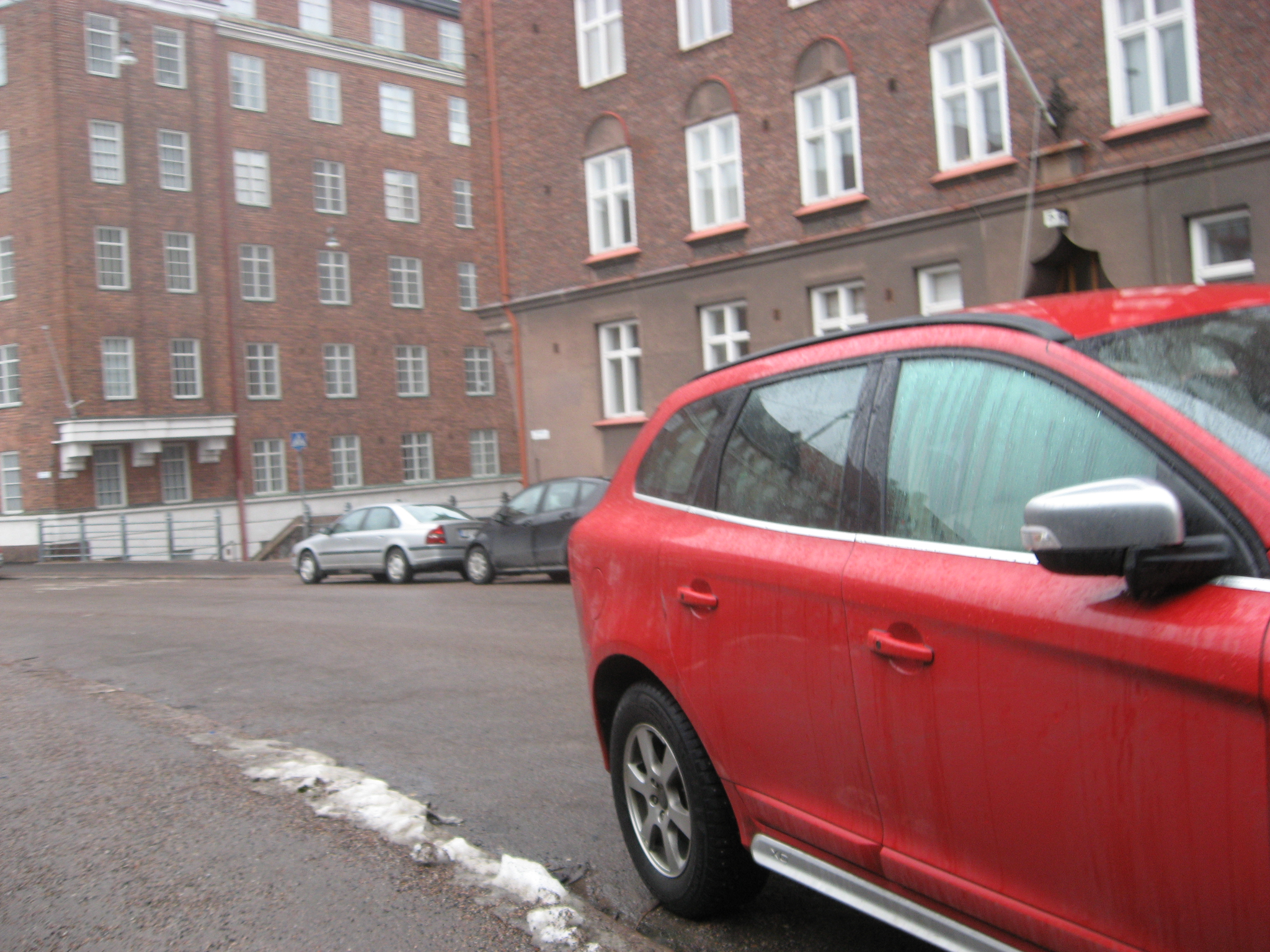 Harvinainen on se päivä, jolloin Kolmannella linjalla Castreninkadun nurkilla ei ole yhtään punaista autoa, usein niitä on varsinainen rypäs samoin kuin Etu-Töölön kortteleissa Temppeliaukion kirkon ympärillä. Tuntuu, kuin punaisuudesta muodostuisi jonkinlainen vetovoima, koska se selvästi vetää puoleensa muita väritovereitaan. Myönnän, että jos olisin valinnut mustan tai harmaan sävyt, ei olisi myöskään ongelmia kadunylityksessä, kun taas vihreän, keltaisen, oranssin ja sinisenkin värin valinneena joutuisin kiertämään korttelia useita kertoja. Yleisten kulkukäytäntöjen mukaan punainen väri on kävelyn pysäyttäjä, jota toisinaan noudatan asfaltin valkoisten raitojen kohdalla. Välillä olen hyväksynyt myös punaiseen toppatakkiin tai punaisiin saappaisiin pukeutuneen kulkijan kadunylitykseen kehottavaksi merkiksi, mutta näitä tilanteita on ollut selvästi vähemmän. Toisinaan saatan kulkea pienen matkan keskellä ajotietä osoittaakseni vain, että tämäkin kuuluu kävelijälle.